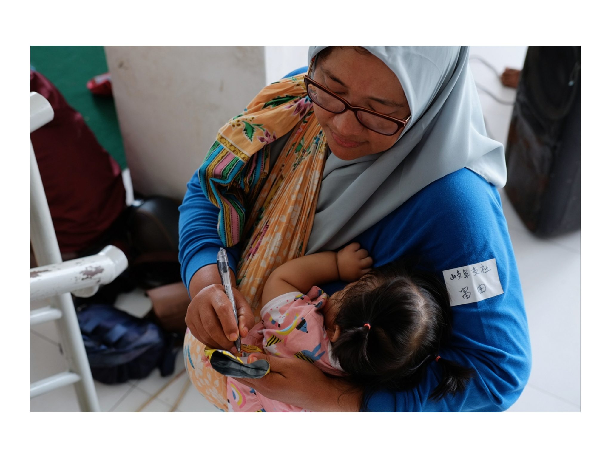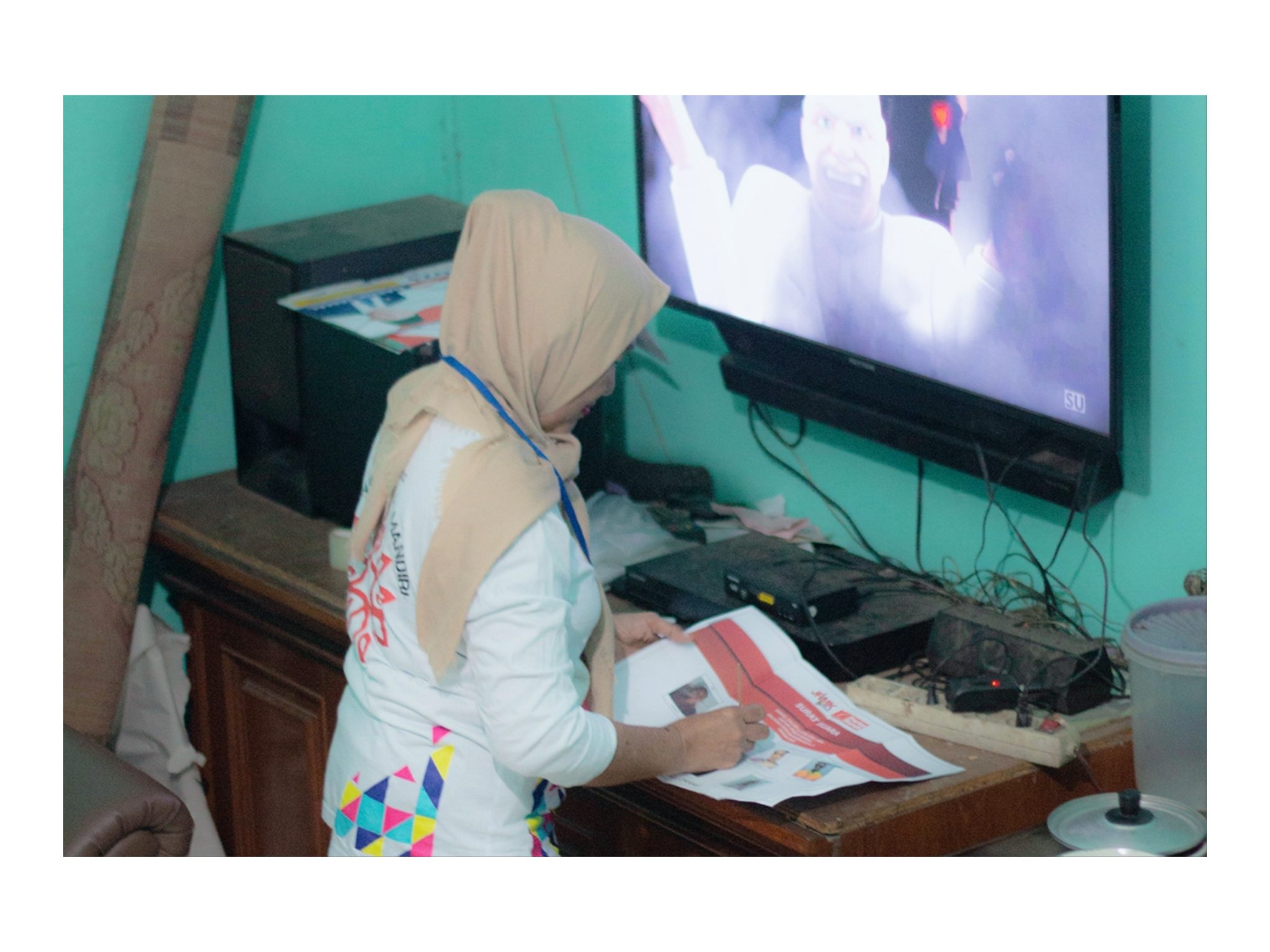 Dharma Diani, warga Kampung Susun Akuarium dan Ketua Panitia agenda penyampaian gagasan bakal calon legislatif (bacaleg) Dewan Perwakilan Rakyat Daerah (DPRD) DKI Jakarta 2024-2029 menulis nama calon legislatif pilihannya sambil mengasuh anak tetangganya. (Project M/Adrian Mulya)