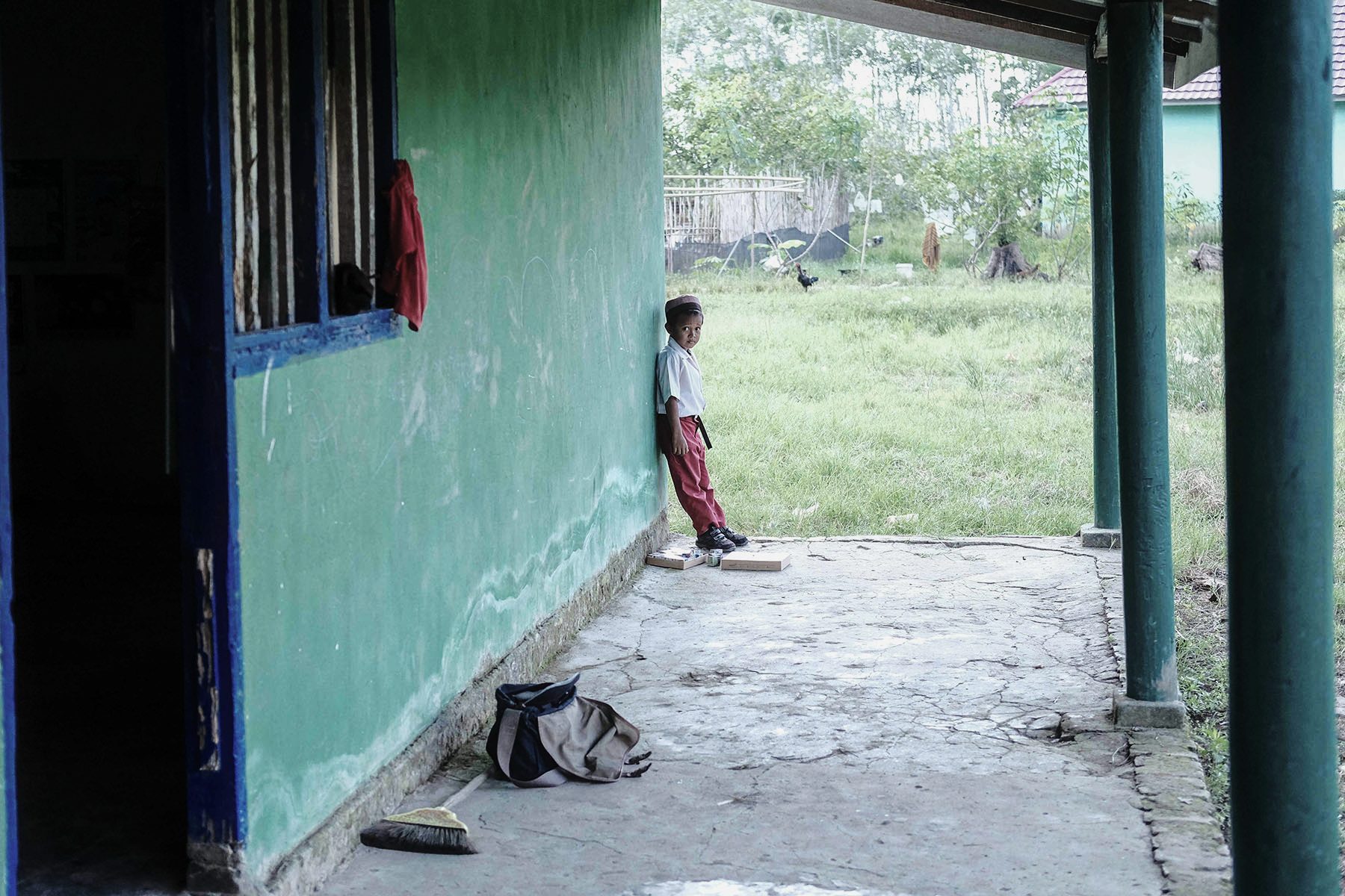 Seorang murid berdiri menyendiri di waktu istirahat. Sekolah gratis ini sangat berarti untuk warga desa. (Project M/Prabu Rizki)