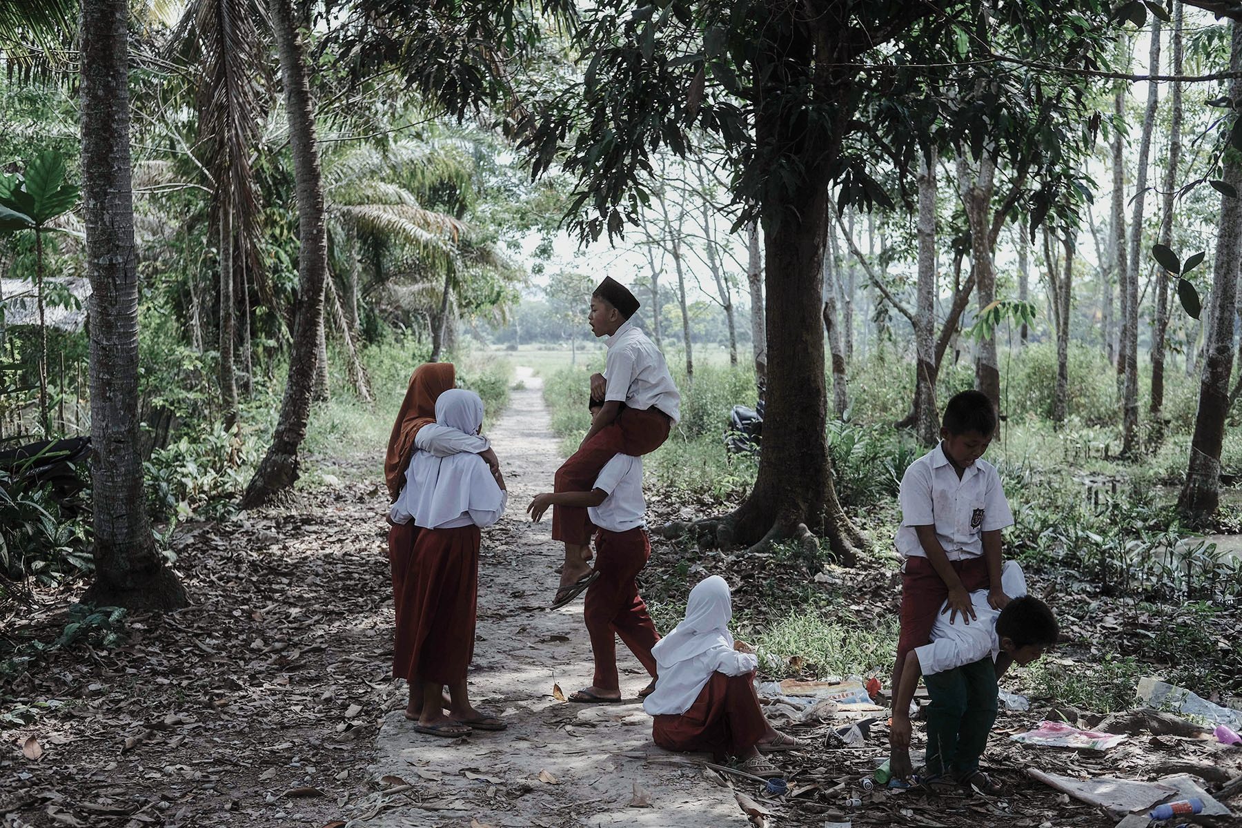 Murid-murid bermain di luar kelas, dekat jalan setapak desa. (Project M/Prabu Rizki)