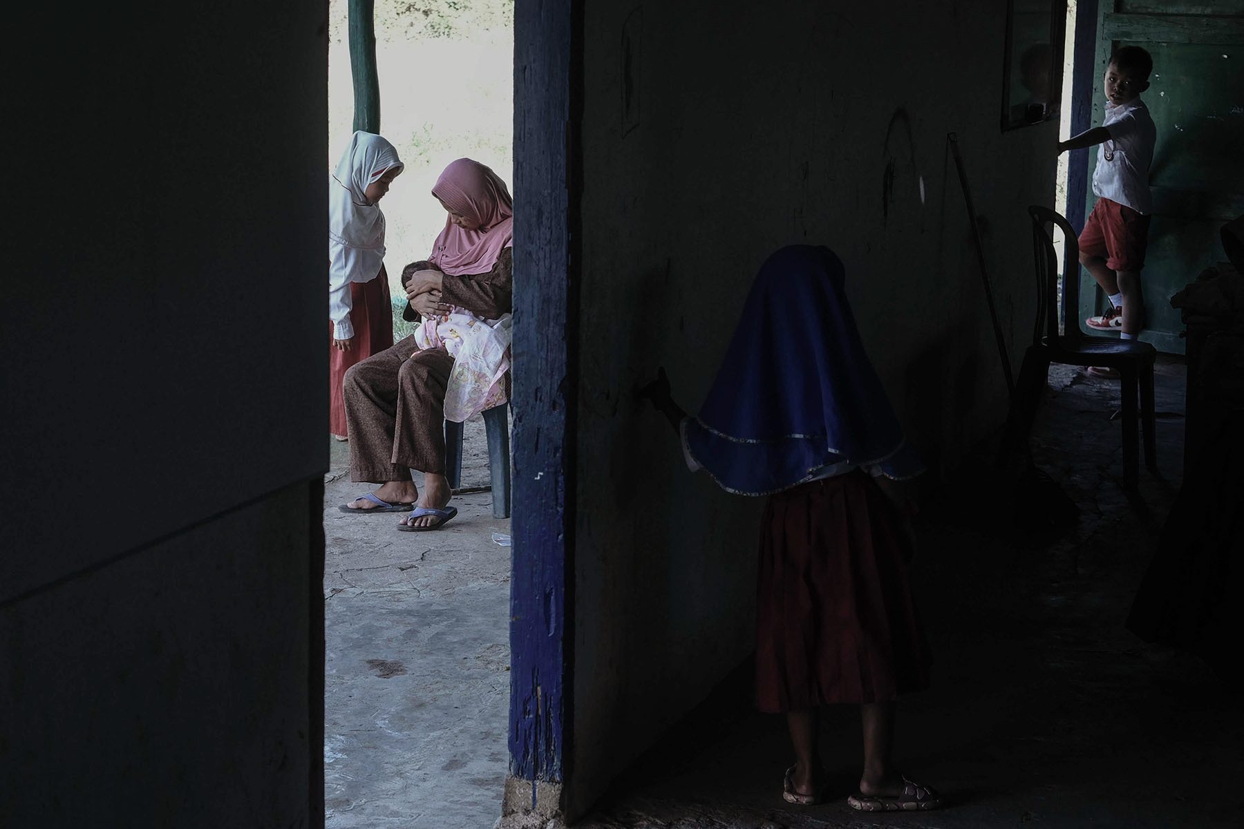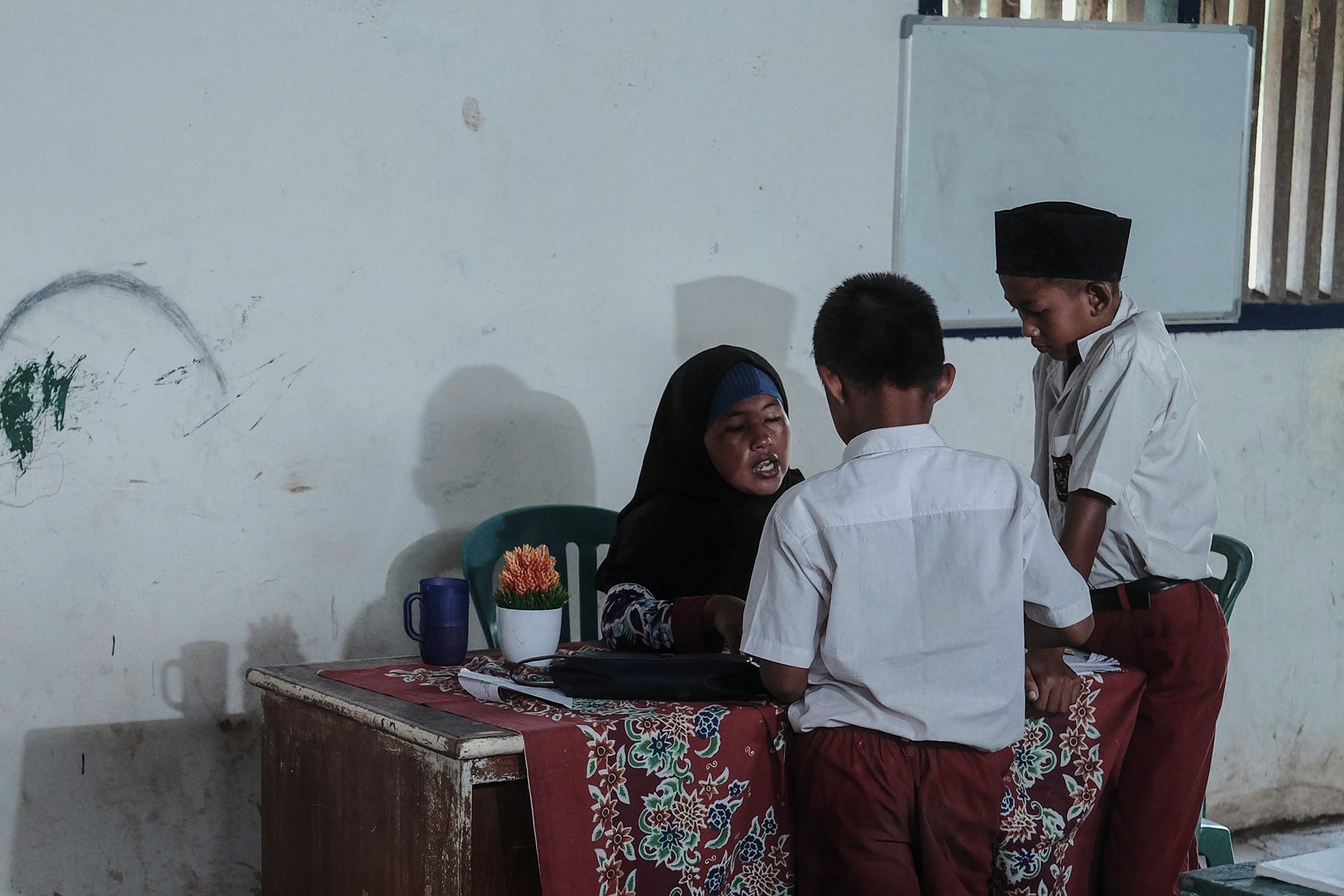 Siti Qomariah mengajar dua muridnya. Hanya ada dua papan tulis yang digunakan bergantian untuk tiap jenjang. (Project M/Prabu Rizki)