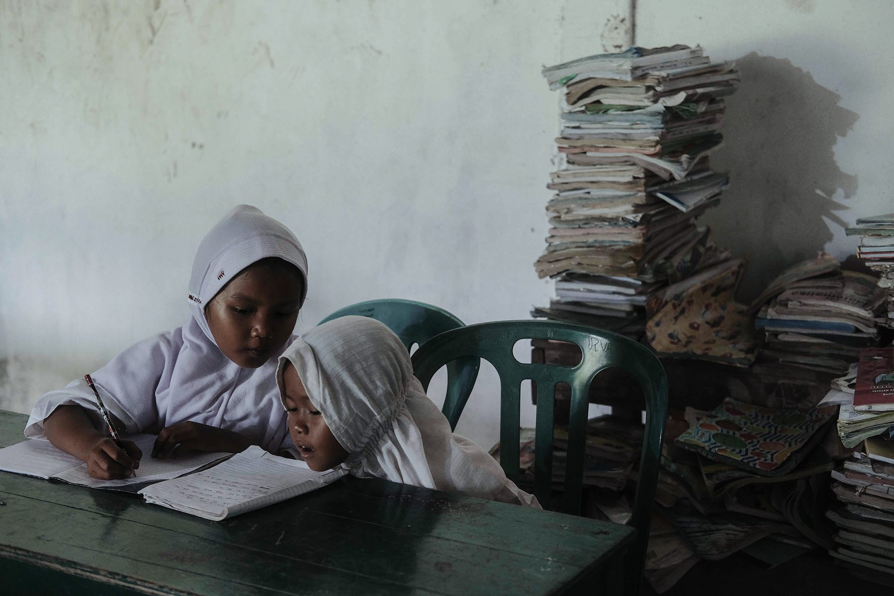 Dua murid sedang belajar di dalam kelas. SD dibangun secara swadaya oleh warga desa pada 1997. (Project M/Prabu Rizki)