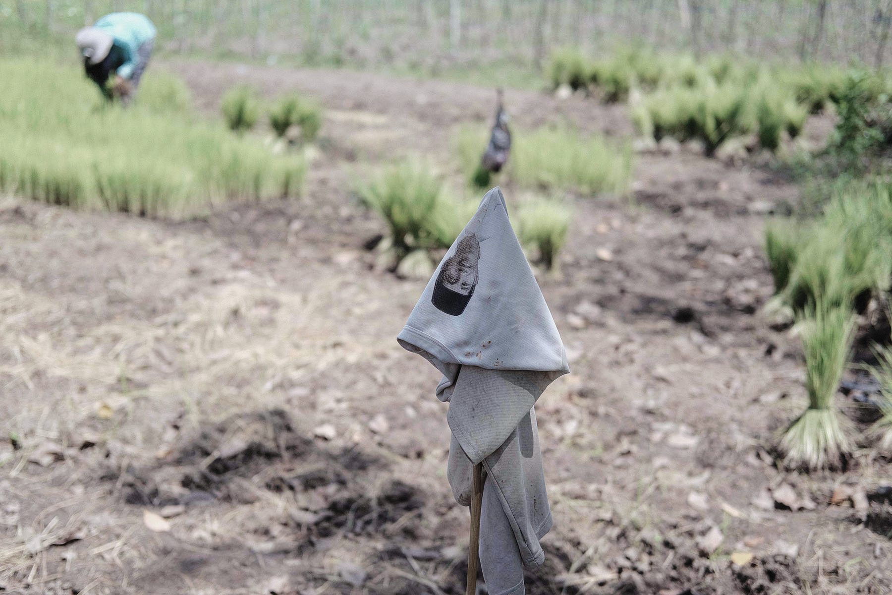 Kaos bergambar Presiden Jokowi tertancap pada tongkat di sawah. Mayoritas warga desa Saluran bertani. (Project M/Prabu Rizki)