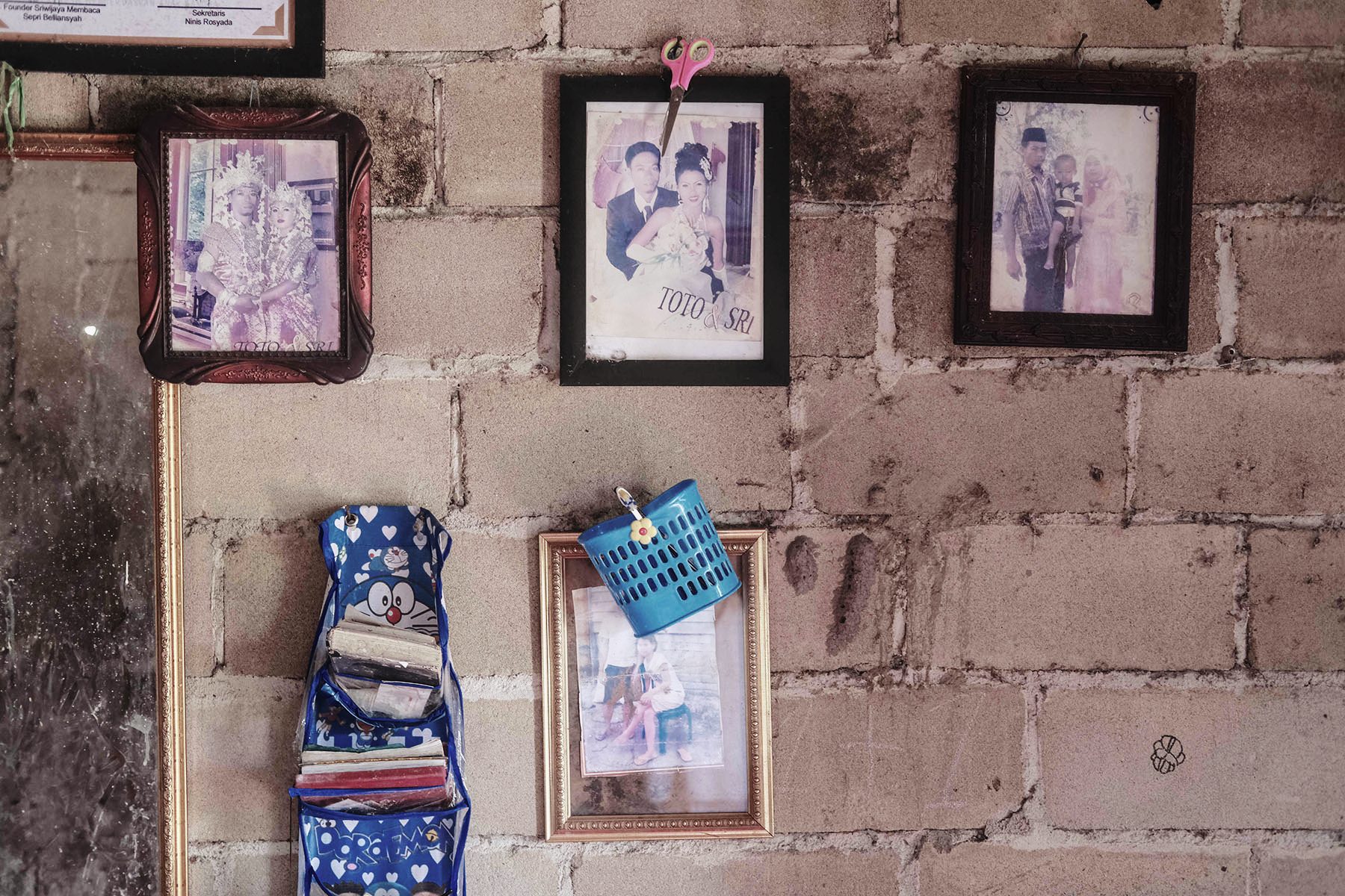 Foto-foto keluarga Siti Qomariah dan Totok tergantung di dinding. (Project M/Prabu Rizki)