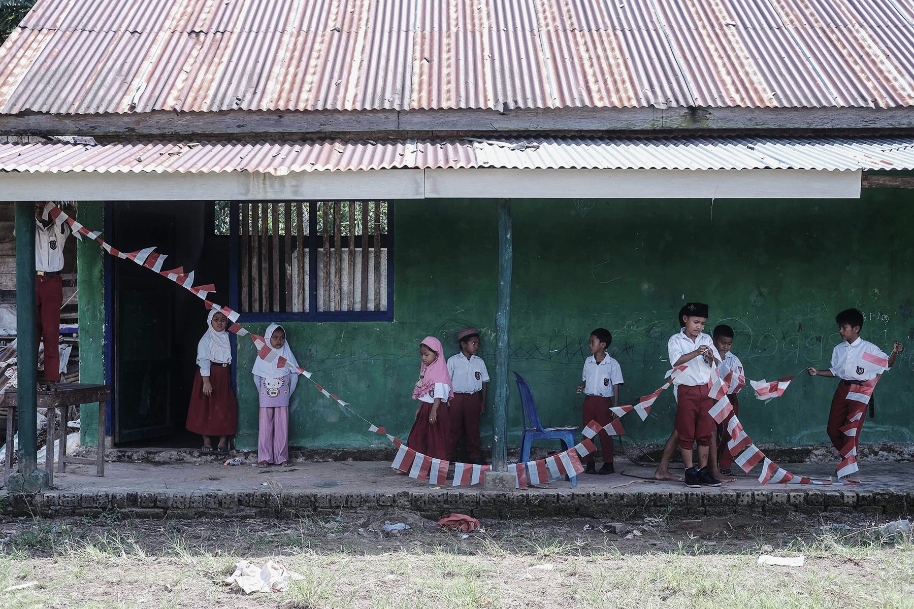 Murid-murid menghias sekolah mereka menyambut Kemerdekaan RI ke-77. (Project M/Prabu Rizki)