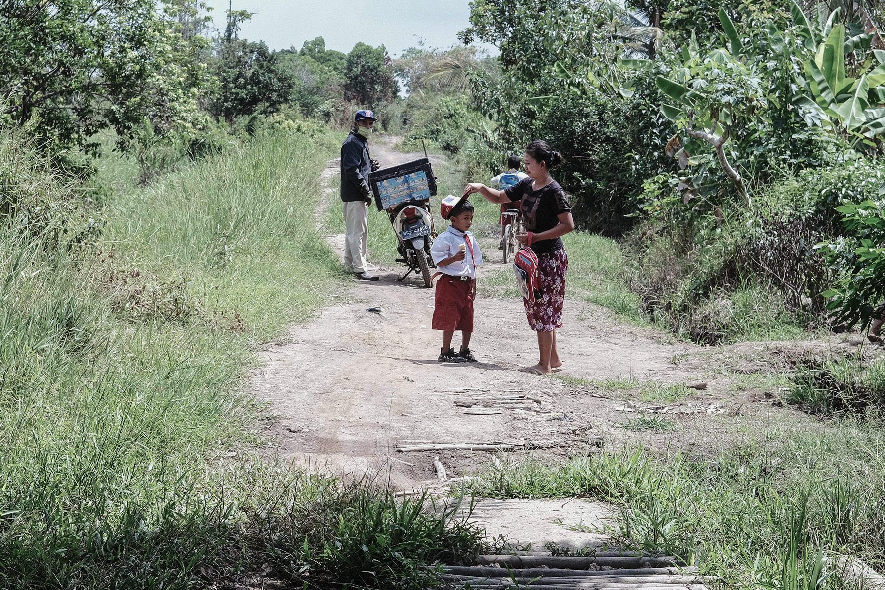 Sumiati harus mengantar dan menjemput anaknya yang duduk di kelas dua dengan menggunakan perahu untuk menyeberangi sungai.