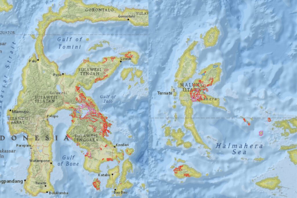 As of 2023, there were 373 nickel mining concessions with ‘clean and clear’ or CnC status issued by the government, either in the form of mining business licenses (Izin Usaha Pertambangan) or contracts of work (Kontrak Karya). These cover a total area of 960,117 hectares. Out of all of the concessions, 309 of these, covering an area of 691,929.6 hectares, are located in South, Southeast and Central Sulawesi. Then, there are 59 concessions in North Maluku and one in Maluku with a total area of 231,486.4 ha