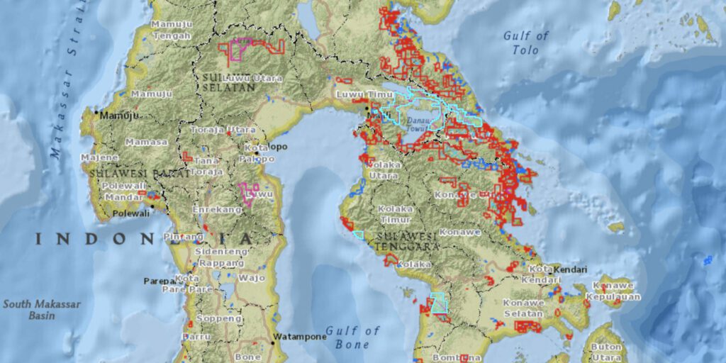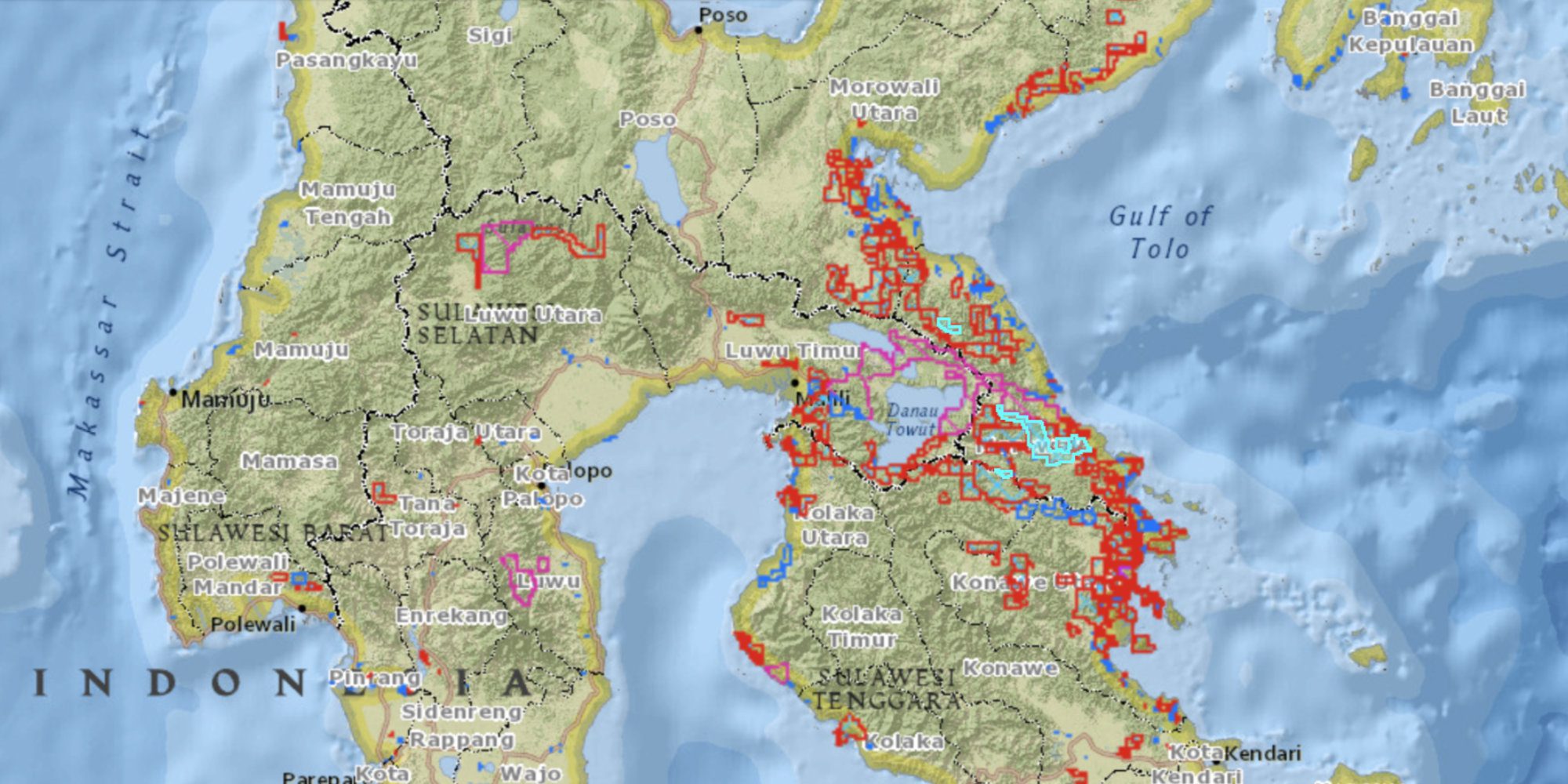 We examined the history, ownership structure and business networks of four nickel mining companies with the largest concessions in Indonesia. The information and data used come from a variety of sources, including the Ministry of Law and Human Rights’ Limited Liability Company Database, the Ministry of Energy and Mineral Resources’ Minerba One Data Indonesia and Minerba One Map Indonesia portals, annual and financial reports of various mining companies, research by non-governmental organizations, court records, and news articles.