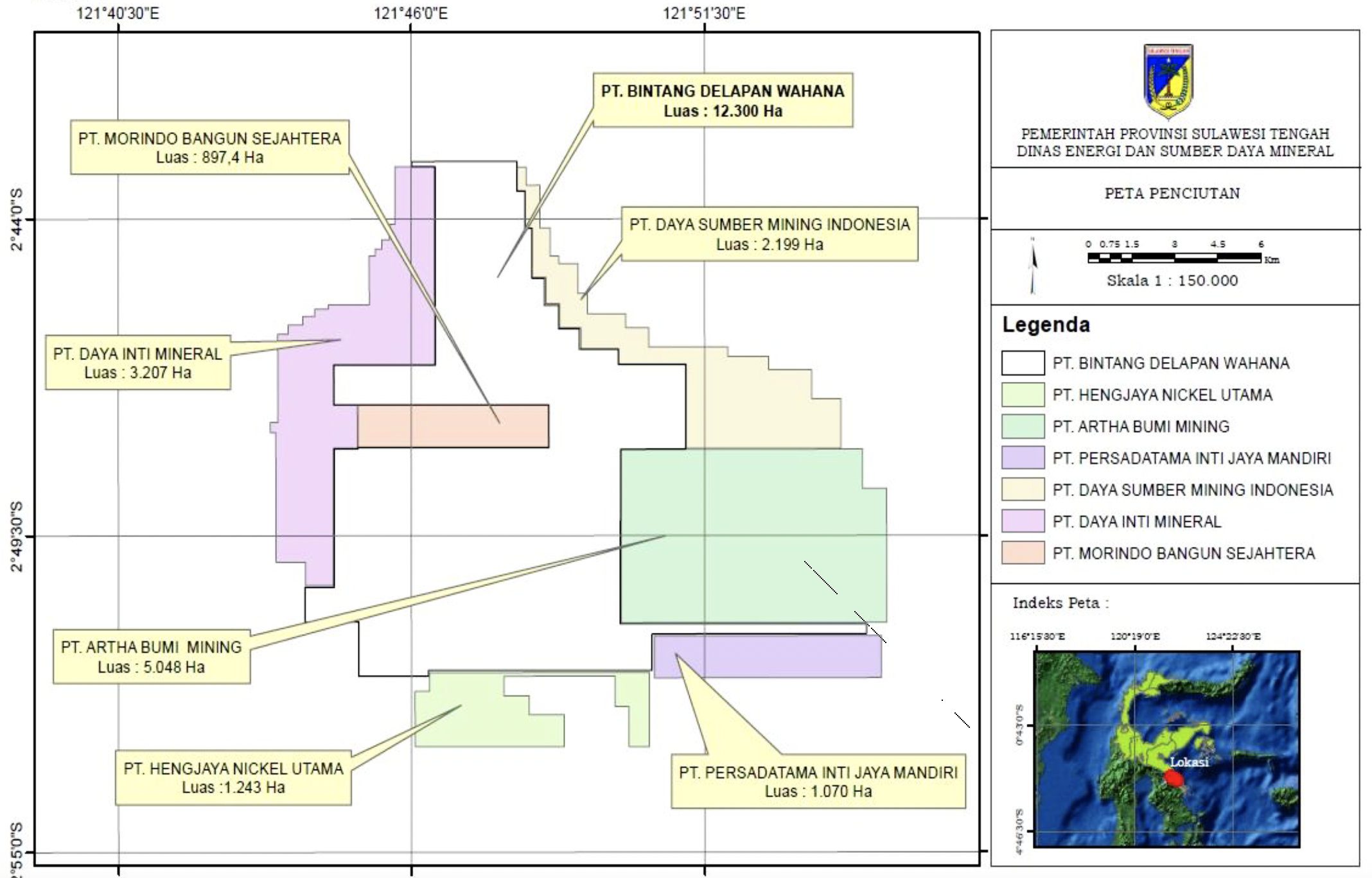 Seven months later, the government changed the boundaries of Central Sulawesi and Southeast Sulawesi so that PT Bintangdelapan Wahana’s area of operation included Morowali, Central Sulawesi. The authority to issue IUPs thus shifted from the Konawe Regent to the Morowali Regent, who then revised the company’s concession area to 20,360 ha in July 2014.