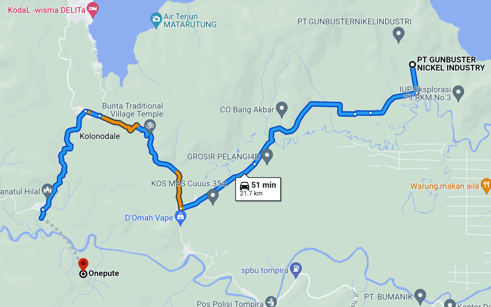 The distance between the local council of SPN in Morowali and PT GNI. (Google Maps)