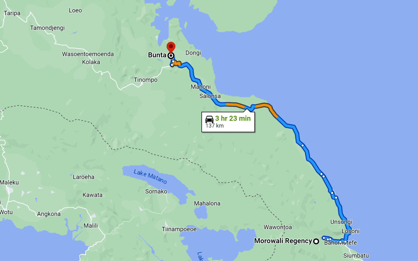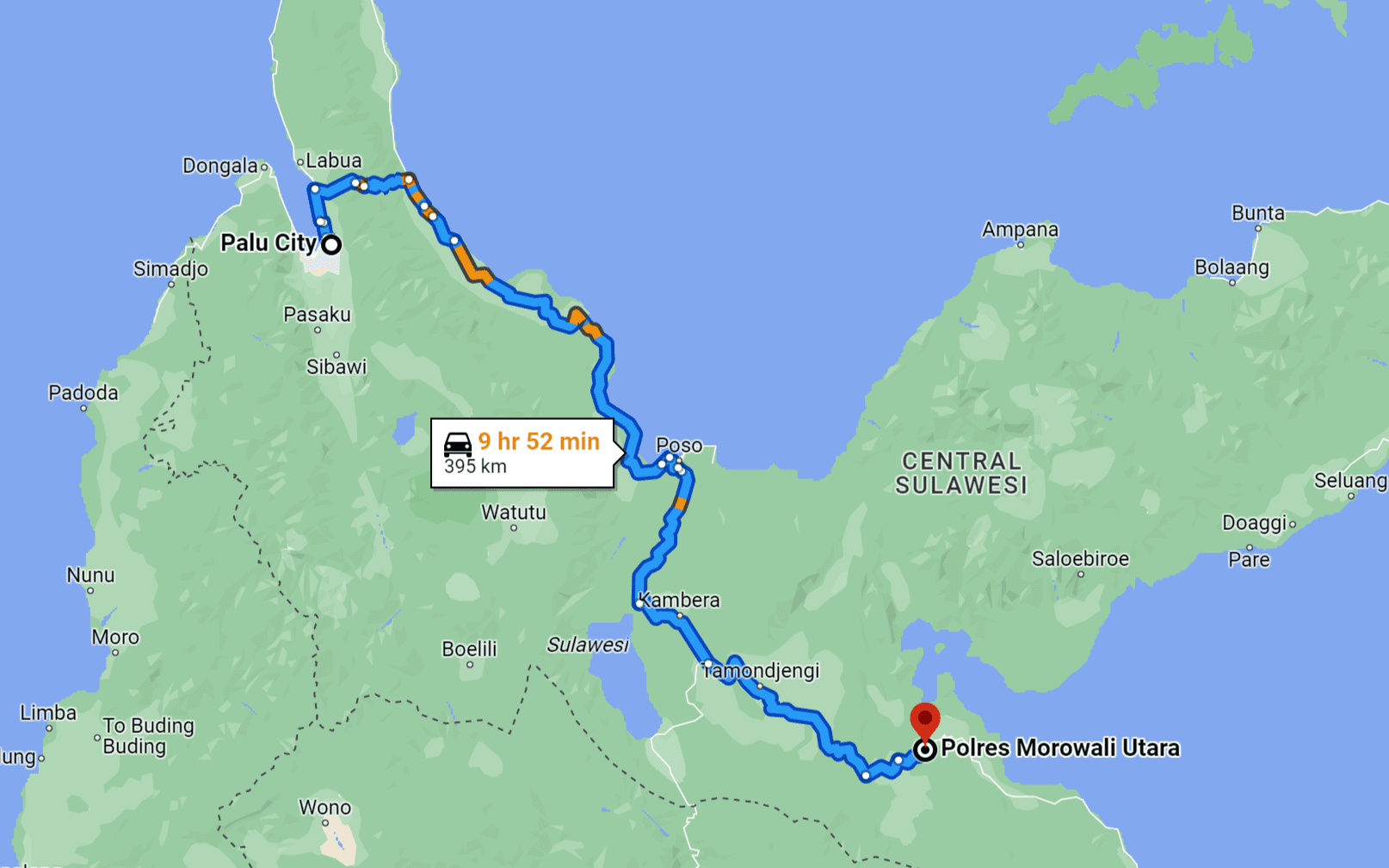The distance that the attorney of the workers have to go through from Palu to the North Morowali Police Station. (Google Maps)