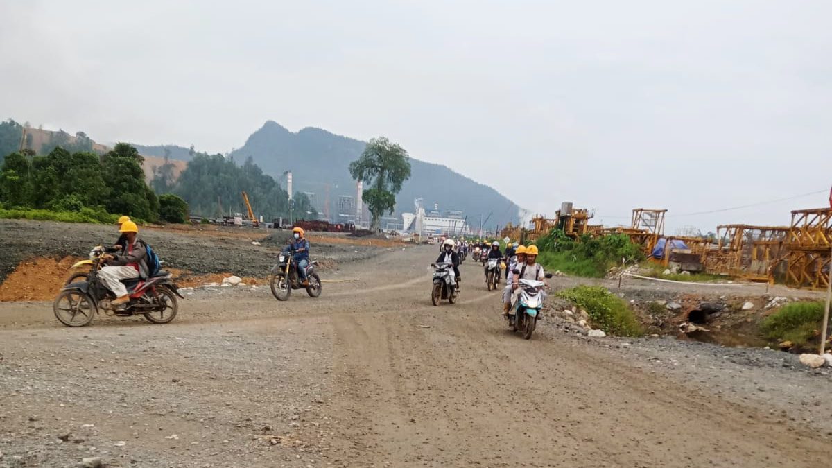 A view of workers going home on motorcycles. Traffic accidents in PT GNI occur regularly because there is no separate route for motorcycles/private vehicles and heavy equipment vehicles. (Project M/Anonymous)
