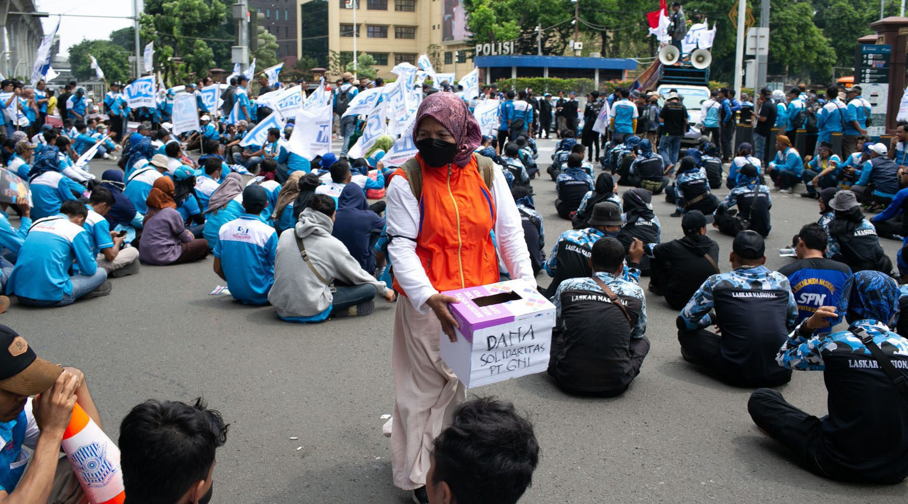 Members of the SPN raise funds during a protest held in front of the National Police Headquarters, Jakarta, on May 11, 2023. They demanded the release of the PT GNI’s workers who they believed were unfairly arrested and detained. (Project M/Adrian Mulya)