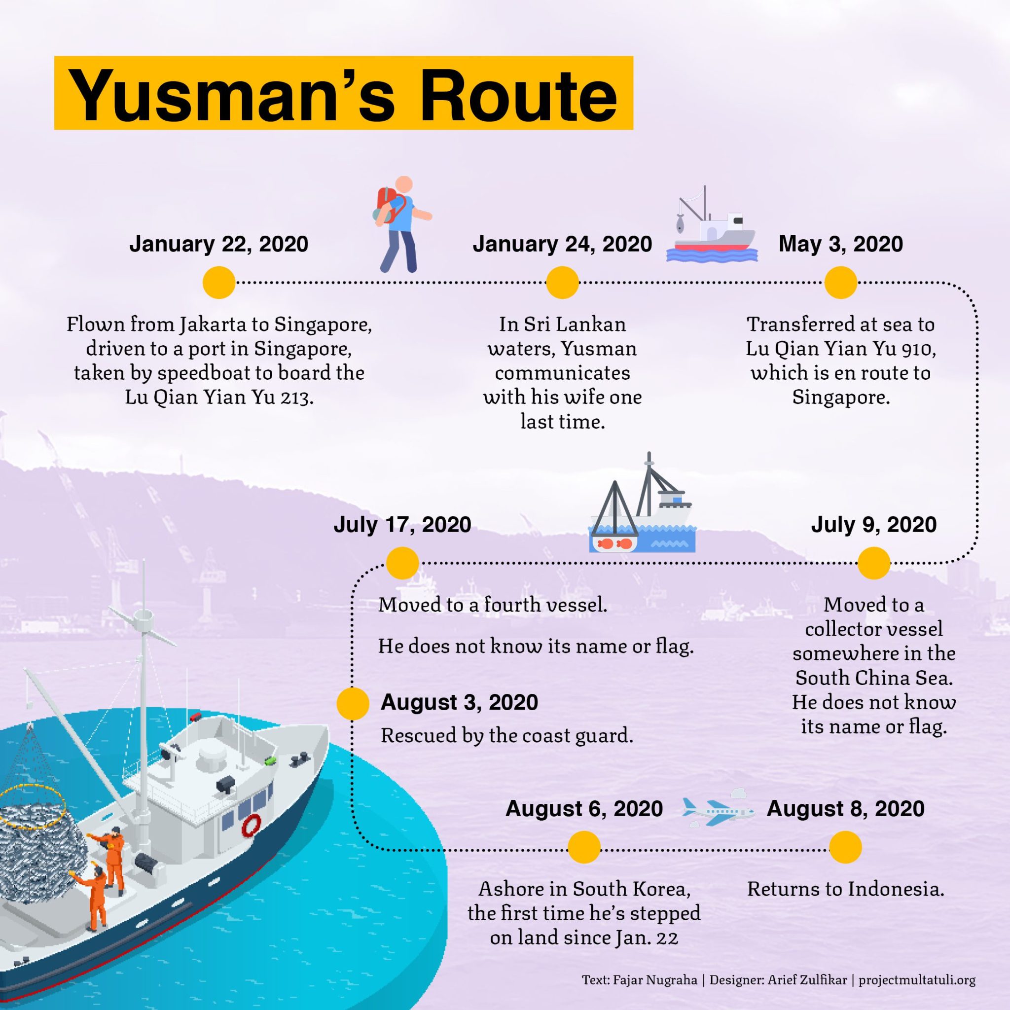 Syafruddin is now serving time in prison for human trafficking. He was imprisoned along with Karyanto and Muhammad Hasbar Yasir, also known as Daeng. They were employees of PT Duta Putra Group, the employment agency that issued a letter on Jan. 24, 2020, naming me and six others as their crew members.