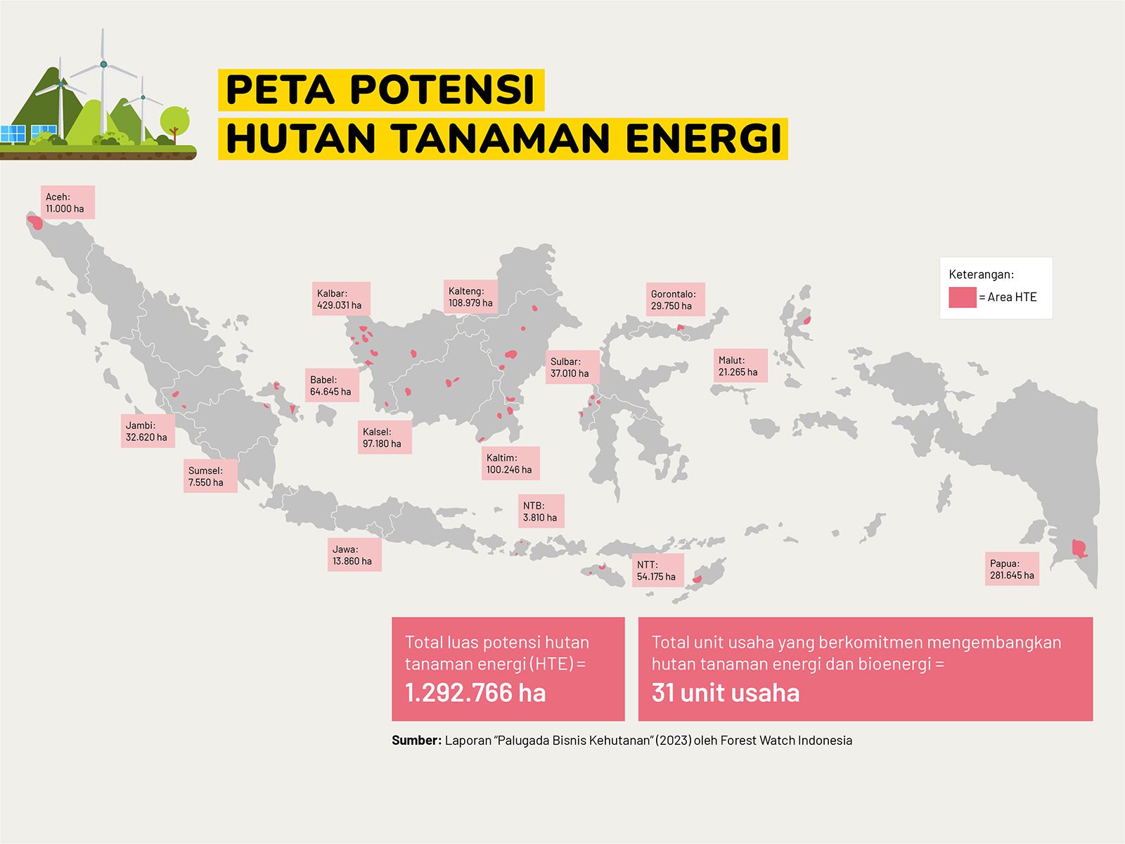 Merujuk hasil riset Trend Asia, dengan asumsi PLN menggunakan pelet kayu untuk dioplos dengan batubara, kebutuhan 10,2 juta ton biomassa per tahun untuk 52 lokasi PLTU dapat dipenuhi dari HTE dengan luas sedikitnya 2,33 juta hektare. Ini setara 35 kali luas daratan Jakarta.