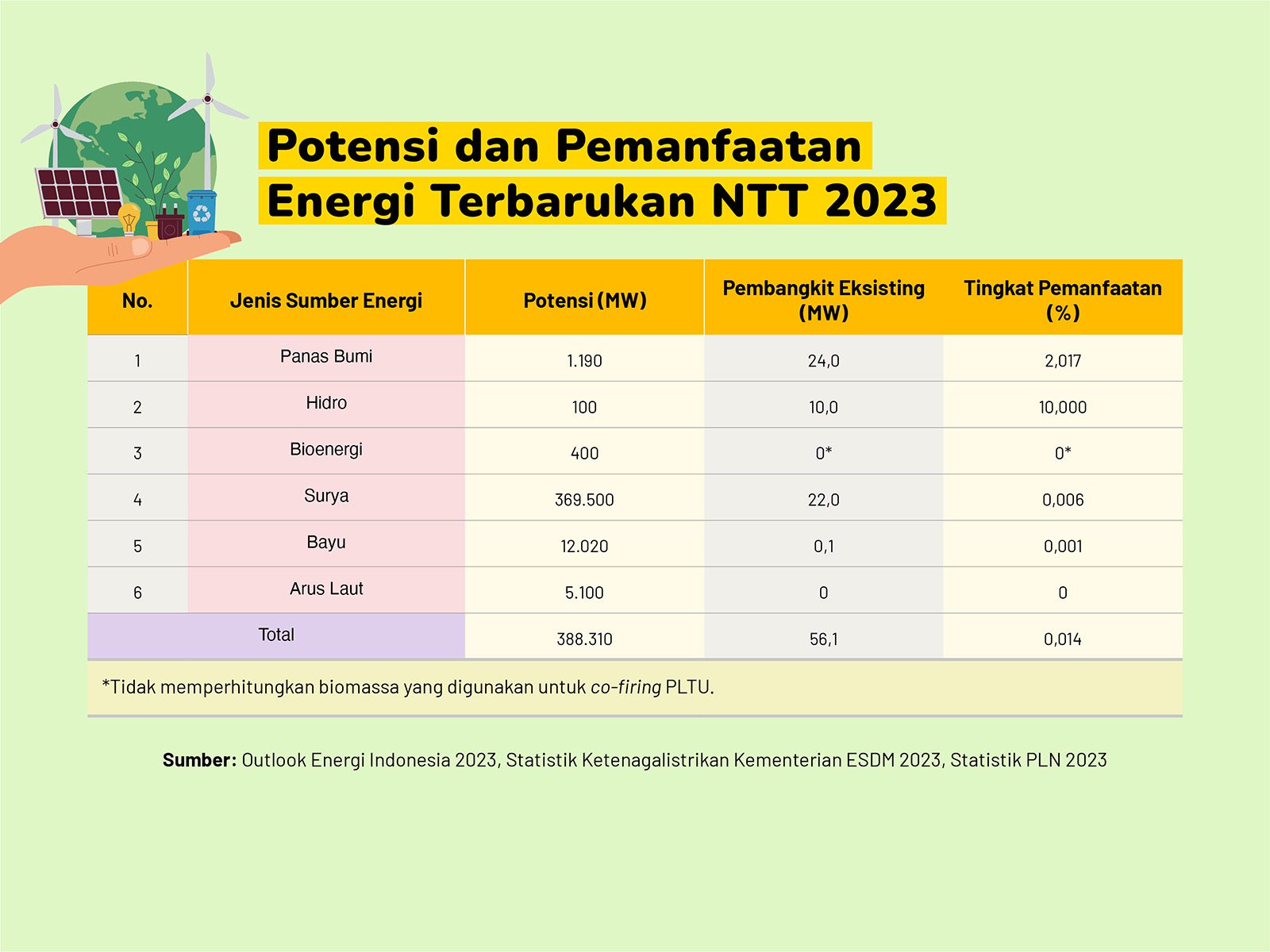 Dari total potensi energi terbarukan NTT sebesar 388.310 MW, baru sekitar 0,01% yang telah dimanfaatkan. Kapasitas pembangkit listrik tenaga surya (PLTS) NTT bahkan baru menyentuh 22 MW per 2023, meski potensinya begitu besar.