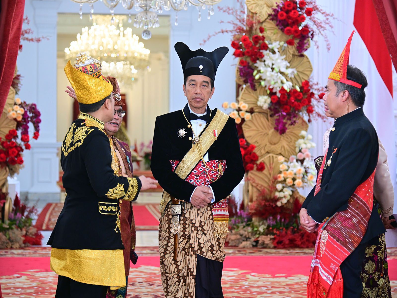 Jokowi mengenakan pakaian adat Ageman Songkok Singkepan Ageng yang biasa dipakai oleh para Raja Pakubuwono Surakarta Hadiningrat pada upacara peringatan HUT ke-78 RI di Istana Merdeka. (BPMI Setpres)