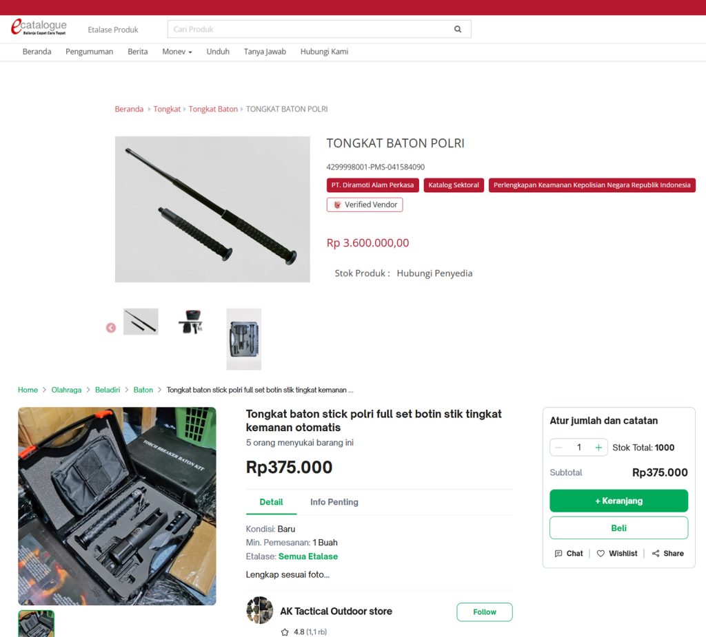 Sementara untuk tongkat baton, harga pasaran di lapak online Rp200-300 ribuan. Sama seperti kacamata, banyak penjual menerangkan bahwa produk yang dijualnya adalah “jatah Polri” atau “jatah polisi”. Stoknya pun banyak. Ada penjual mencantumkan memiliki stok 1.000 tongkat baton.
