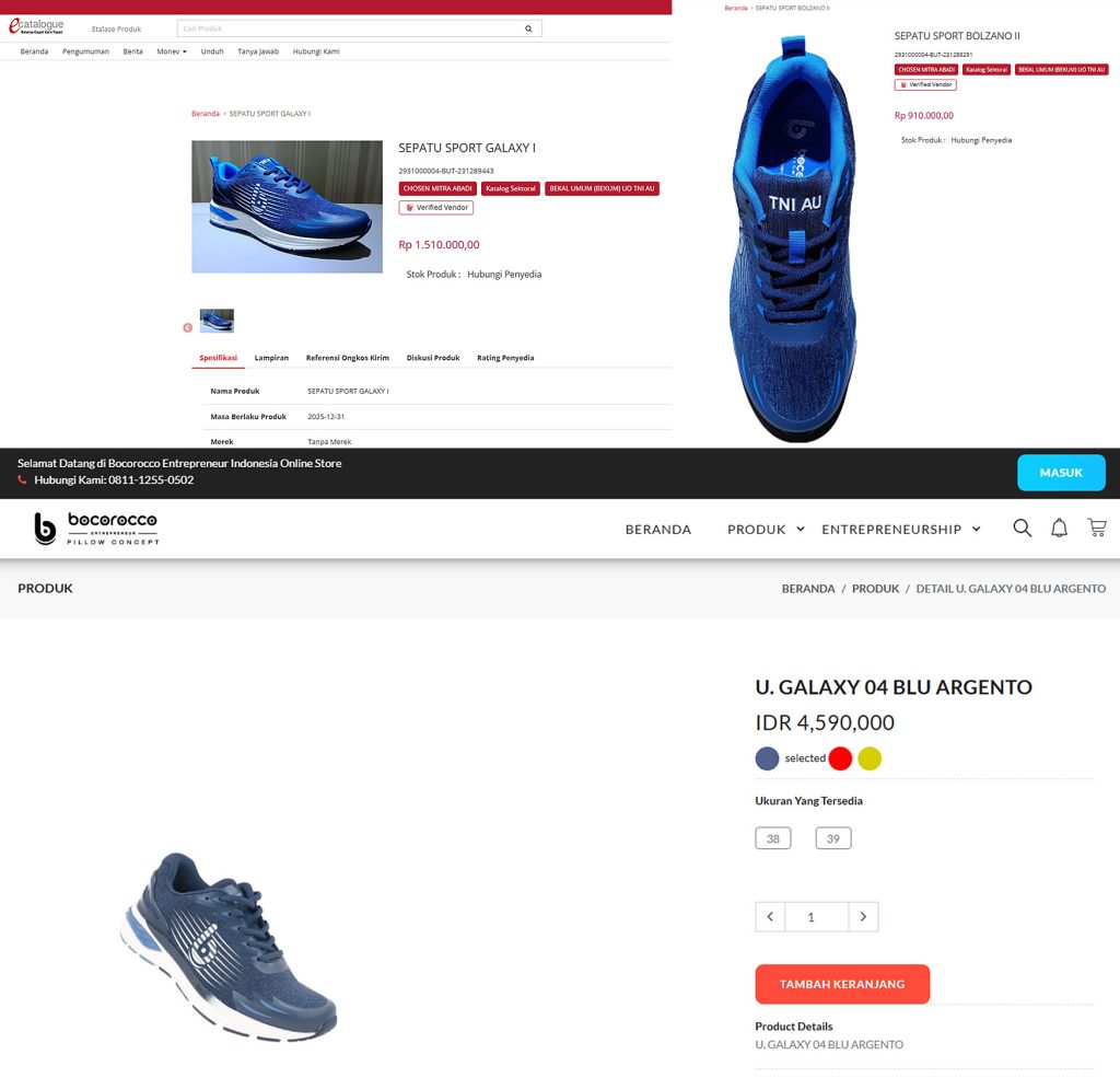 Dari laman LKPP, saya juga menemukan ada pembelian sepatu merk BOLZANO II dari anggaran Kemenhan senilai Rp3,4 miliar. Dari penelusuran di e-katalog, sepatu itu memiliki bentuk yang sama persis dengan sepatu GALAXY I. Perusahaan penyedia sepatu, keterangan dan spesifikasi di e-katalog juga sama, bedanya hanya harga. Harga sepatu merk Bolzano II Rp910 ribu.