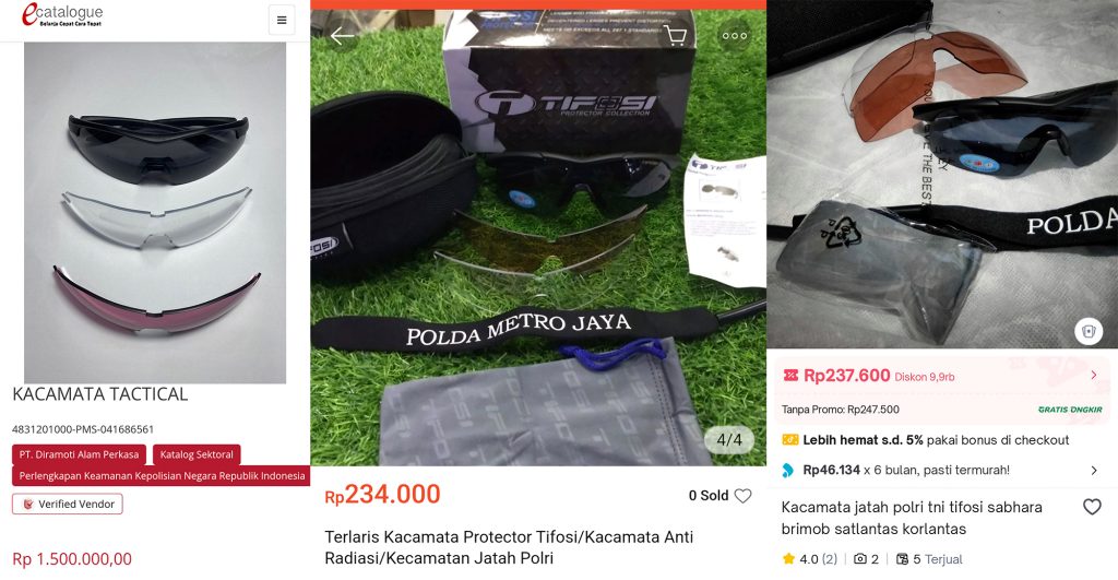 Di lapak daring, saya menemukan ada banyak kacamata yang sama dijual dengan kisaran harga Rp200-Rp300 ribuan. Menariknya, ada banyak penjual yang menyatakan bahwa kacamata yang dijual itu kacamata “jatah Polri”. Dalam foto yang ditampilkan juga terlihat tulisan Polda Aceh, Polda Banten, Polda Metro Jaya, Polda Jawa Timur, dll. Kemasan dan kacamatanya sama dengan yang diulas oleh polisi di YouTube.