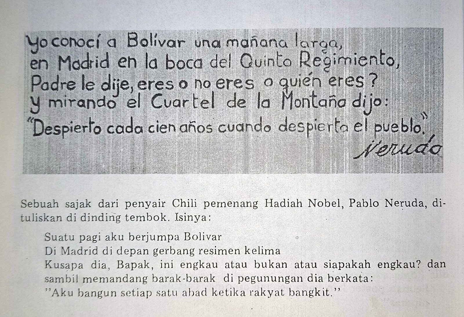 Potongan puisi Pablo Neruda berjudul “Sebuah Ode untuk Bolívar” dalam buku Jalan Demokratis ke Sosialisme: Pengalaman Chili di Bawah Allende oleh Arief Budiman.