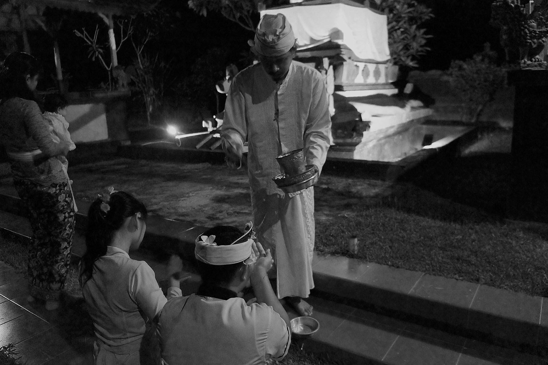 DI BAWAH benderang bulan, tiga lelaki bersimpuh di tanah kering, menghadap semak belukar, merapalkan doa-doa. Malam itu, Rabu (13/7/2022), adalah malam yang suci–bulan sedang berada tepat di belakang bumi. Andre dan dua kawannya menunaikan kewajiban mereka sebagai umat Hindu: Melaksanakan ibadah purnama.