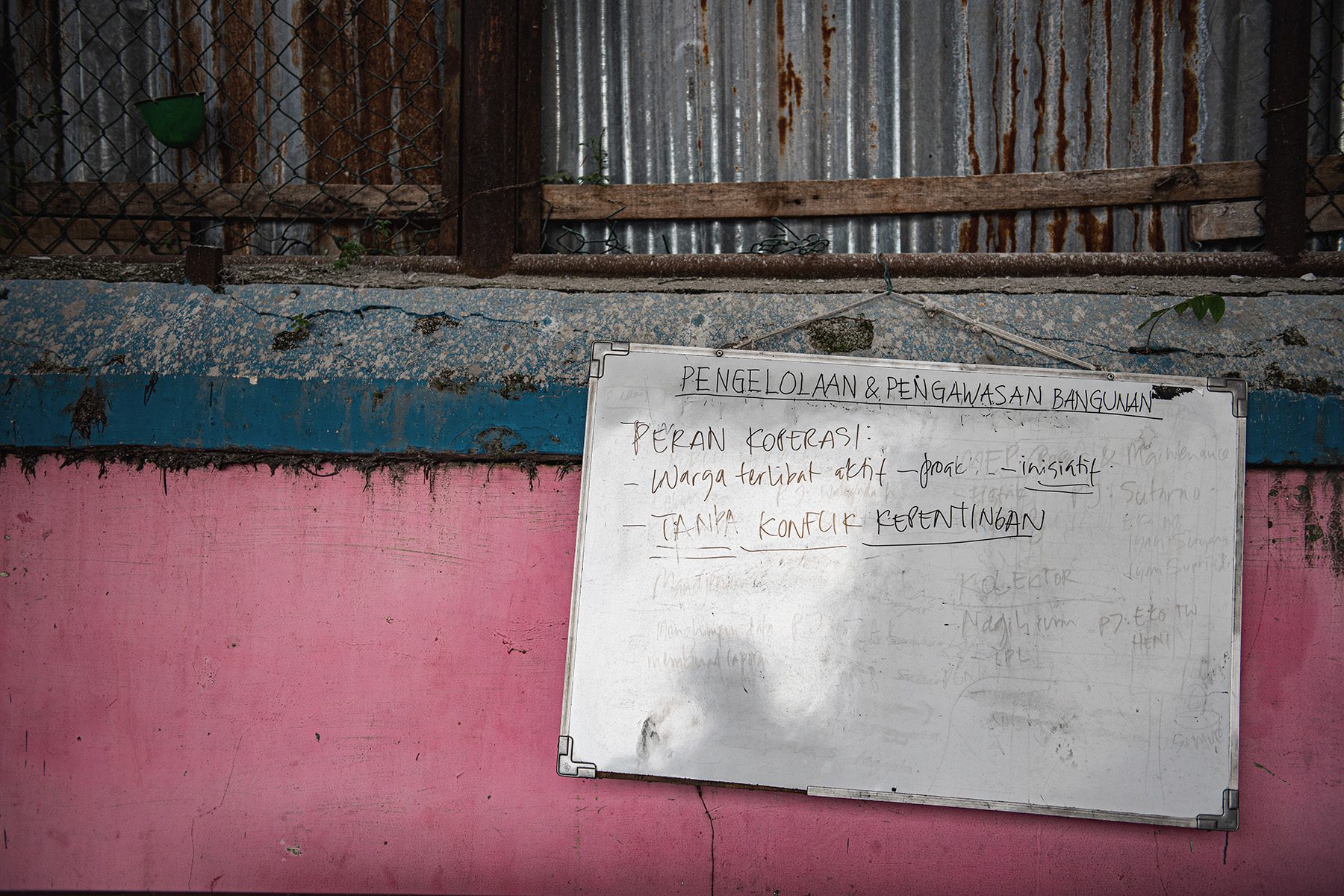 Papan mengenai peran koperasi warga tergantung di dekat projek Kampung Susun Kunir, Tamansari, Jakarta Barat. (Bhagavad Sambadha)