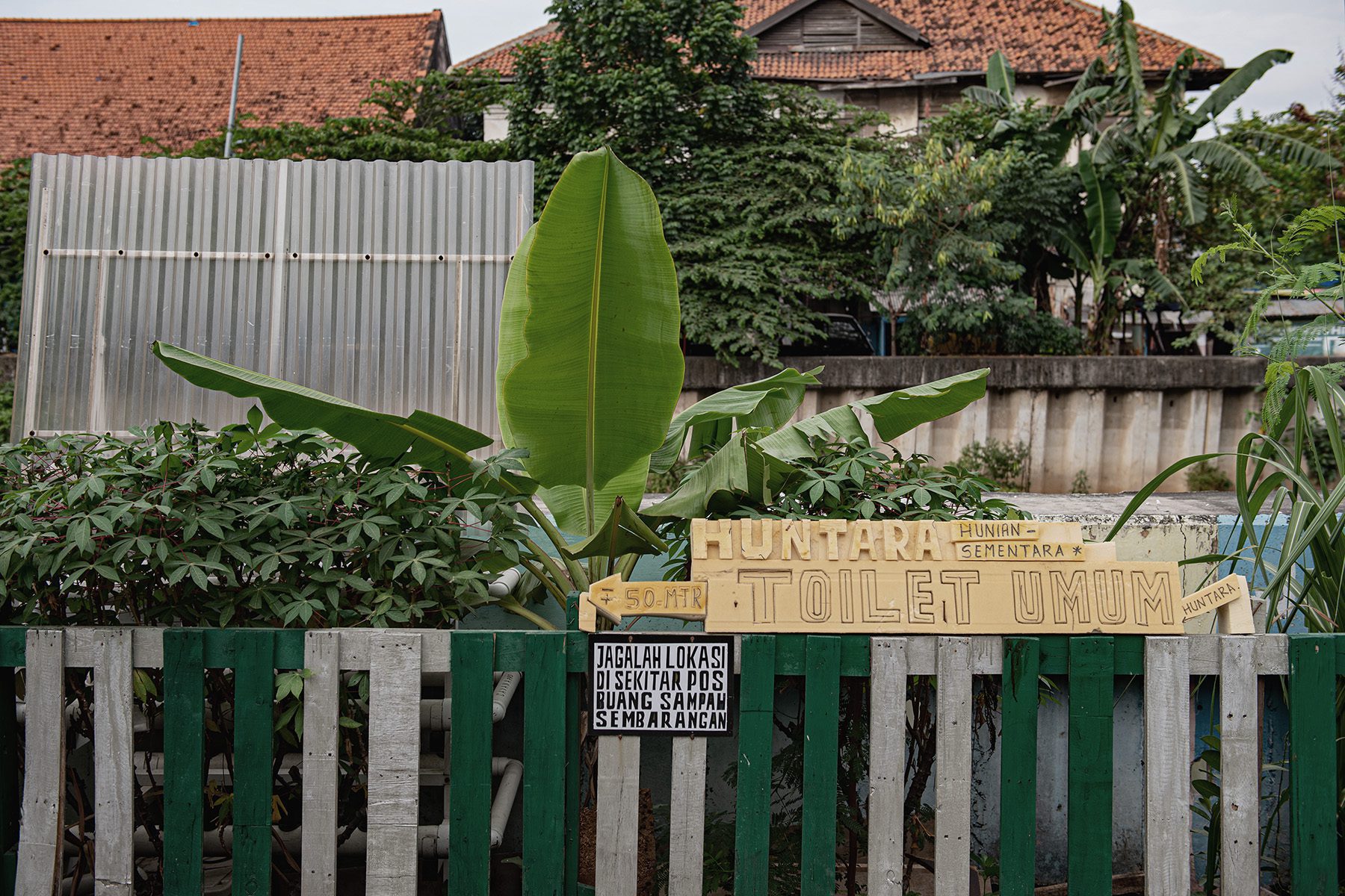 Papan penunjuk jalan menuju toilet umum Kampung Kunir, Taman Sari, Jakarta Barat. Toilet umum dikelola secara kolektif oleh warga Kampung Kunir melalui koperasi dan menjadi sumber pemasukan untuk memenuhi kebutuhan-kebutuhan dasar warga serperti air bersih.(Bhagavad Sambadha)