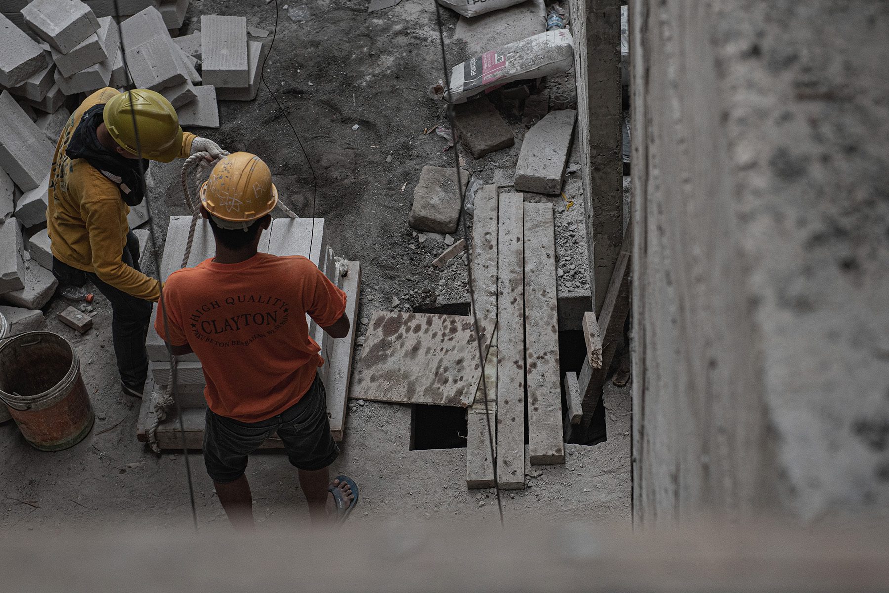 Dua pekerja menggarap pembangunan Kampung Susun Kunir, Taman Sari, Jakarta Barat (27/6/22). Ditargetkan selesai pada 17 Agustus 2022, warga Kampung Kunir berharap pembangunan tersebut selesai tepat waktu dan segera bisa ditempati. (Bhagavad Sambadha)
