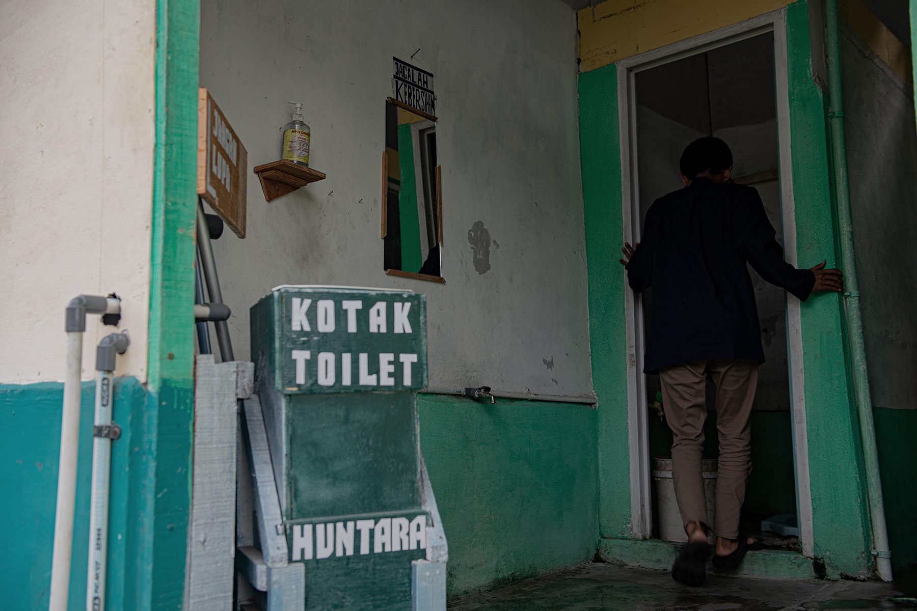Seorang pria menggunakan toilet umum Kampung Kunir, Taman Sari, Jakarta Barat (27/6/22). Selain warga setempat, toilet umum juga digunakan oleh para pekerja projek kampung susun dan pekerja gudang ekspedisi yang banyak terdapat di sekitar Kampung Kunir. (Bhagavad Sambadha)