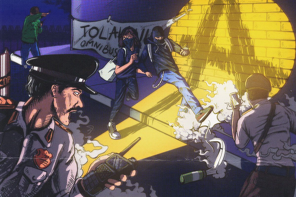 Kepolisian Indonesia kerap berburu anak muda berkaos hitam-hitam yang disebut sebagai anarko. Mereka, anak muda yang memiliki kepedulian sosial dan politik ini, dijadikan kambing hitam, ditangkap, dan mendapatkan kekerasan.