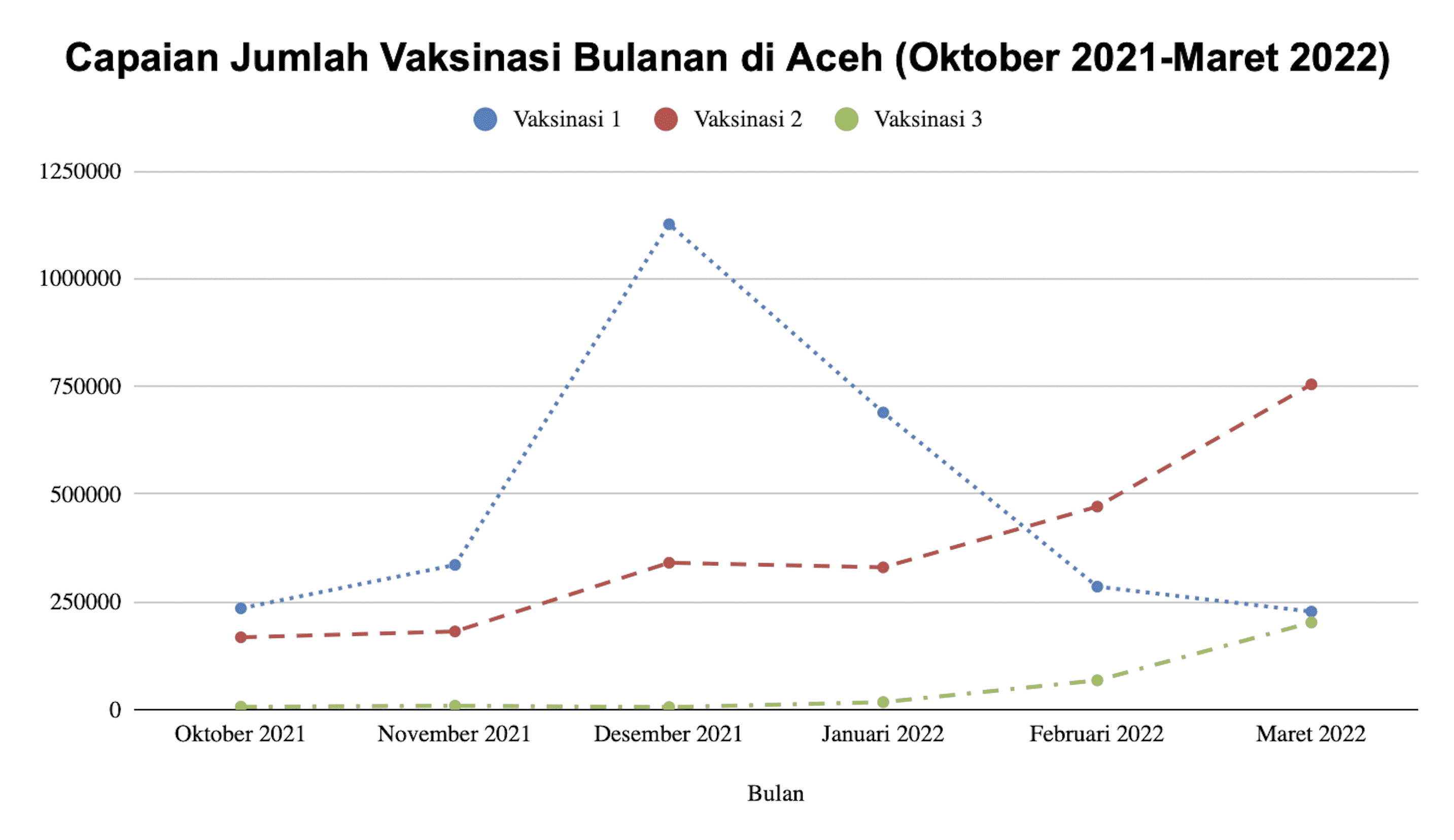 Data Kementerian Kesehatan menunjukkan vaksinasi dosis pertama di Aceh pada Oktober 2021 totalnya mencapai 235.364 orang dengan rata-rata harian 7.592 orang. Pada November capaian jumlah vaksinasi mencapai 336.056 orang dengan rata-rata harian 11.202 orang. Bila dilihat tidak terjadi lonjakan yang signifikan. Namun, pada Desember, melambung tinggi hingga mencapai 1.126.407 orang dengan rata-rata harian 36.336 orang, hampir tiga kali lipat dari bulan sebelumnya.
