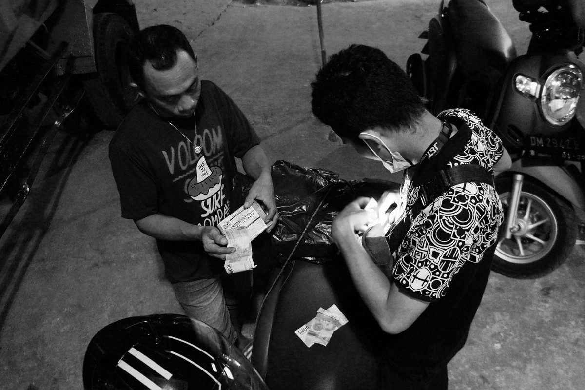 Di depan sebuah gerai, Rifkiansyah Suleman (22) sibuk bolak-balik membopong sebuah bungkusan yang hampir seukuran tubuhnya. Ia terlihat kelimpungan mencari bagian yang kosong dari sadel motornya, sebab yang tersisa hanya bagian kecil yang sedari awal dilapangkan untuk bokongnya. Hampir seluruh bagian motor dipenuhi bungkusan berwarna hitam, membuat warna merah terang motor itu menjadi tampak gelap. Tiga bungkusan raksasa tersebut berisi paket yang harus ia antar hari itu juga, Selasa 11 Mei 2021.