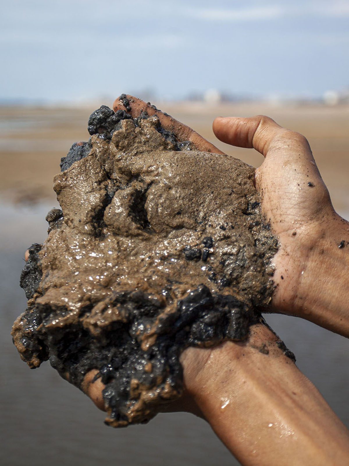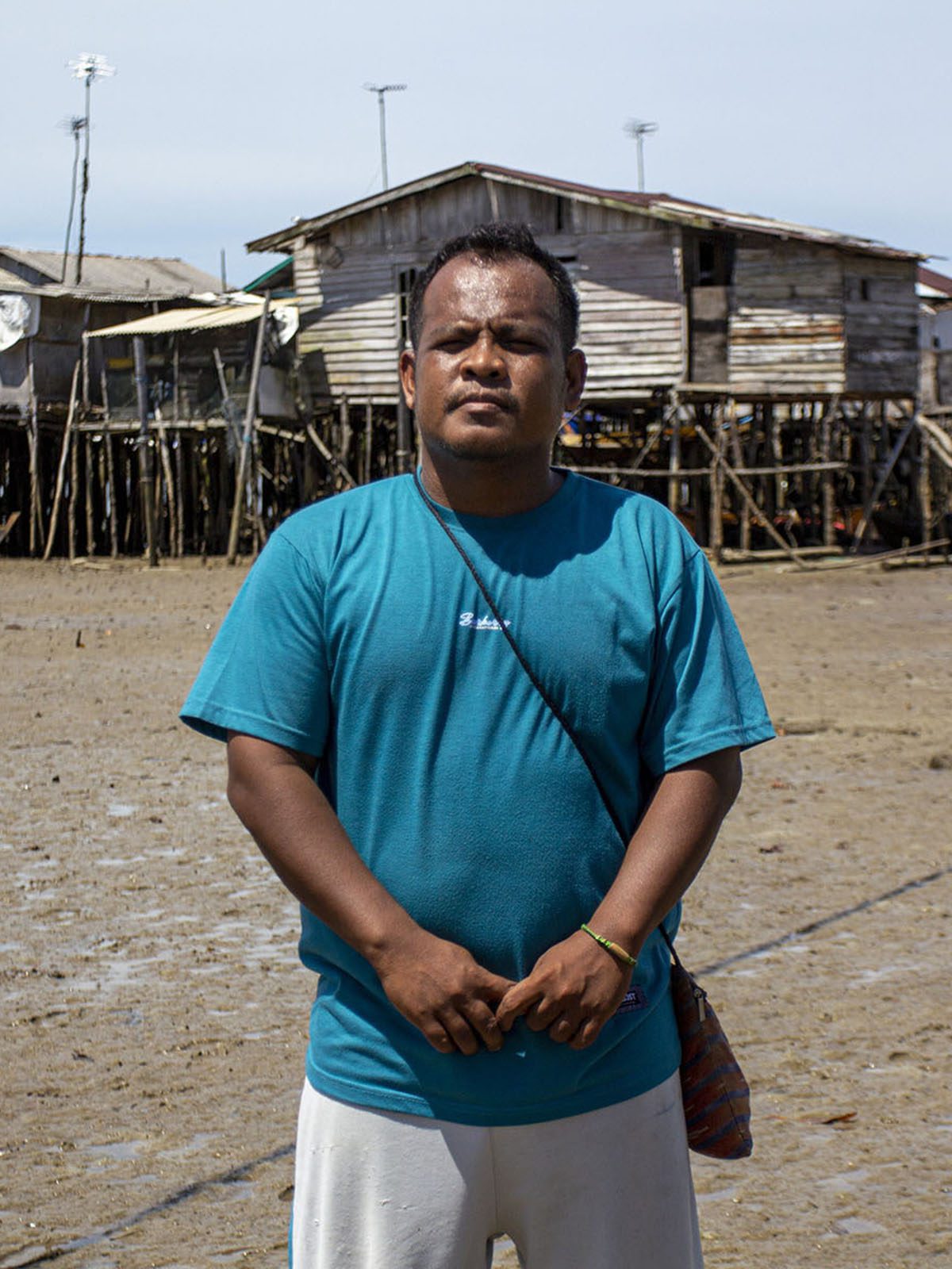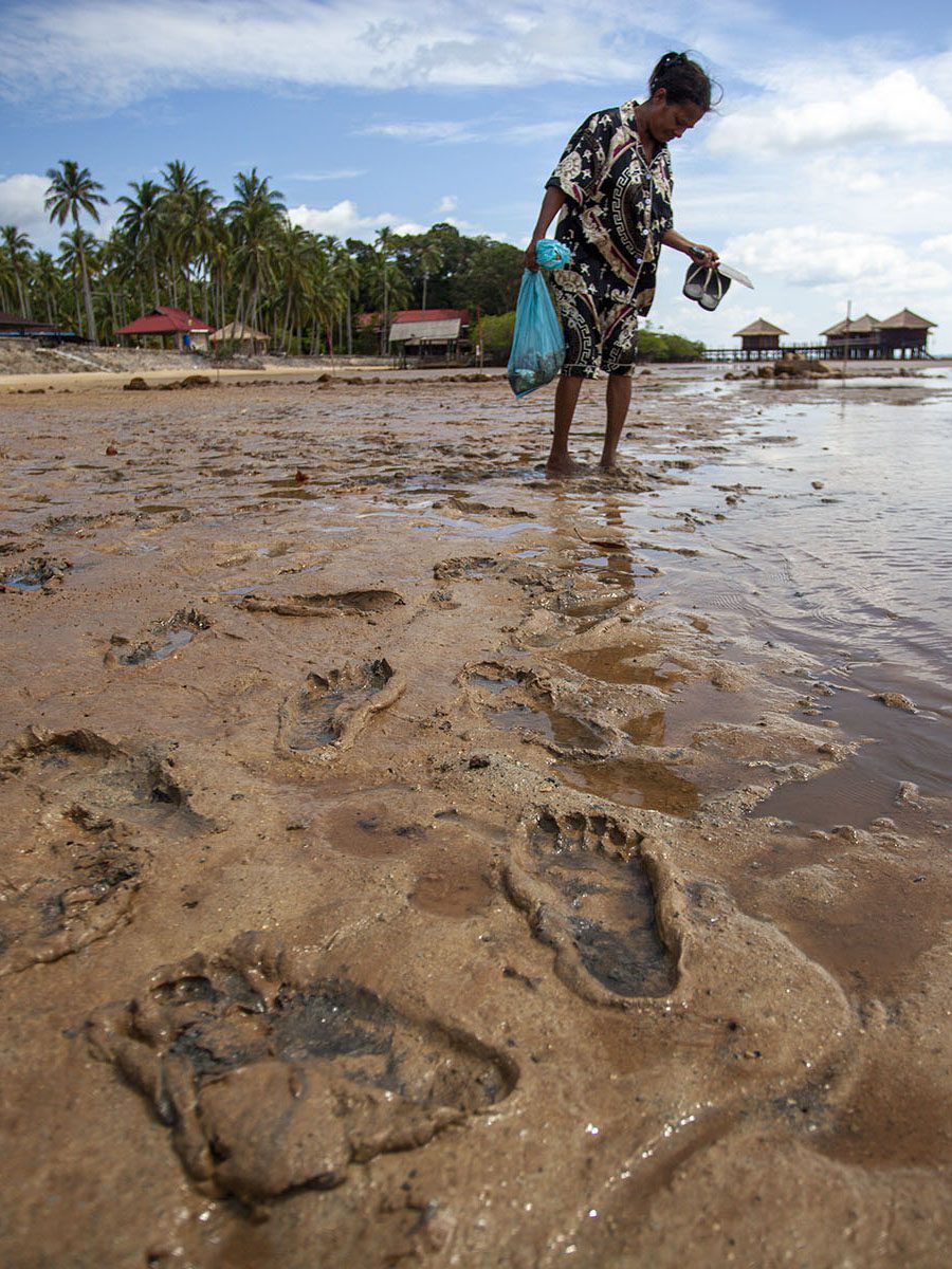 “Dulu lumpurnya tak begini. Ini lumpurnya hitam,” kata Jembol sembari memegang lumpur dari laut tempat biasanya dulu mereka mencari gonggong, saat air surut. “Sekarang gonggongnya pun sudah tidak ada.”