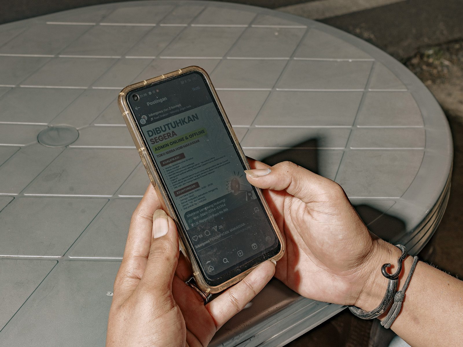 Seorang pemuda mencari informasi lowongan kerja di salah satu platform media sosial. Informasi lowongan kerja banyak bertebaran di media sosial,, namun posisi kerja yang ditawarkan sering tidak sesuai keterangan awal atau ternyata itu adalah modus penipuan. (Project M/Iqbal Lubis)