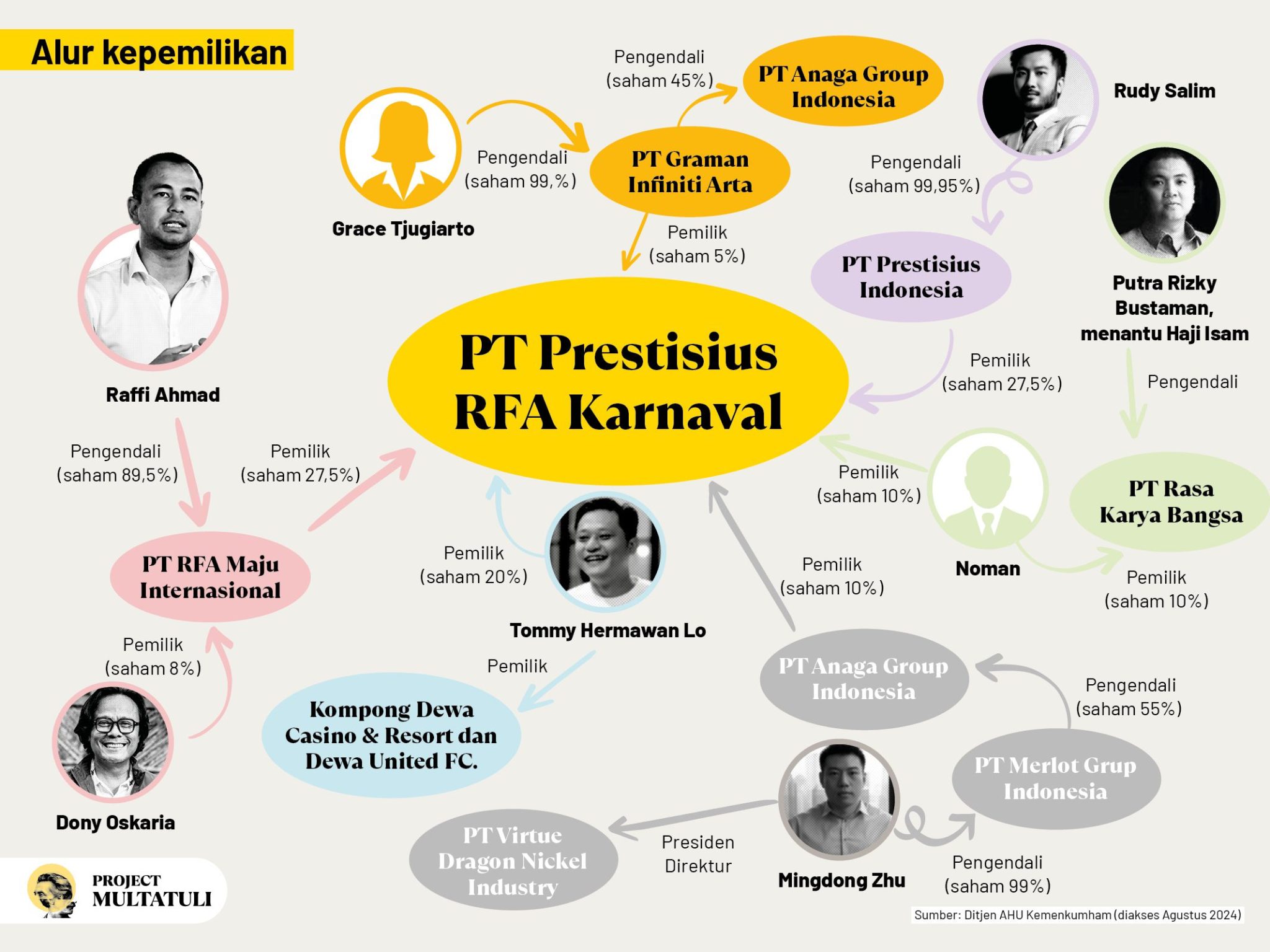 Relevan dengan ucapan Egi, di bisnis Raffi, ada Dony Oskaria, Direktur Utama PT Aviasi Pariwisata Indonesia (Persero) atau InJourney, perusahaan induk BUMN. Dony memiliki saham di PT Rans Entertainmen Indonesia dan PT RFA Maju Internasional.
