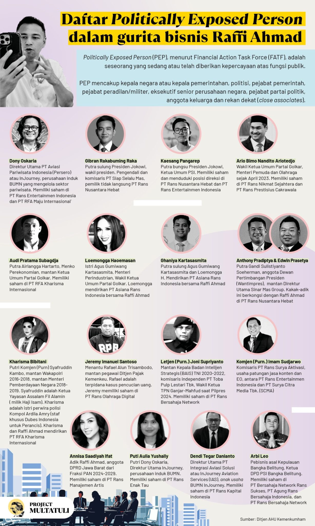 Project Multatuli menemukan 17 individu yang terindikasi sebagai politically exposed person (PEP) dalam bisnis Raffi Ahmad.
