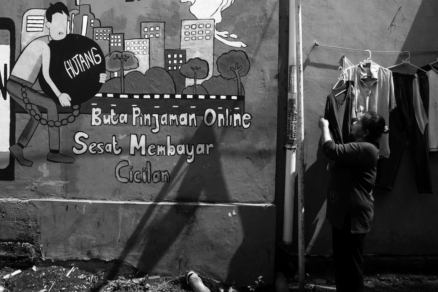 Seorang perempuan menjemur pakaian di dekat mural waspada pinjaman online di Surabaya. (Project M/Fully Syafi)