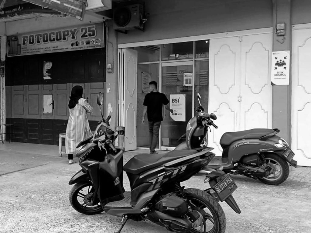 Sesampainya di bank BSI, Musafir dan Samsuardi, yang menggendong bayi, berdiri di teras kedai fotocopy Counter 25 di samping bank sembari mengamati istri Samsuardi yang masuk ke dalam anjungan tunai mandiri (ATM) bank BSI. Perempuan itu terlihat menggenggam plastik kresek, sementara Miswar berdiri di depan ATM.