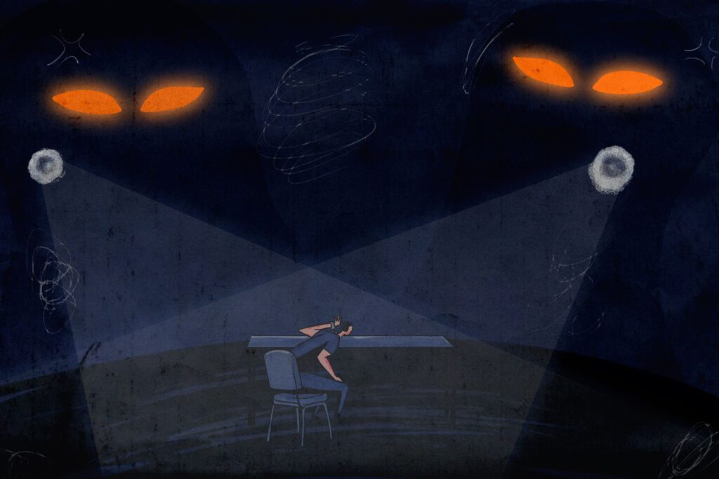 Ilustrasi penyiksaan korban salah tangkap polisi. (Project M/ Azka Maula – CC BY-NC-ND 4.0)