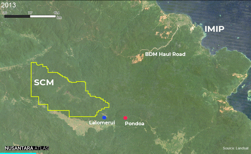 Sepanjang Sulawesi dan Maluku Utara, berjajar perusahaan tambang nikel yang membongkar 76.000-an ha kawasan hutan, yang luasnya melebihi luas DKI Jakarta, menurut lembaga advokasi lingkungan Mighty Earth. Dan, karena berada dalam area konsesi pertambangan nikel, lebih dari setengah juta hektare hutan atau sekira seluas Pulau Bali di sana terancam musnah, ujar Mighty Earth.