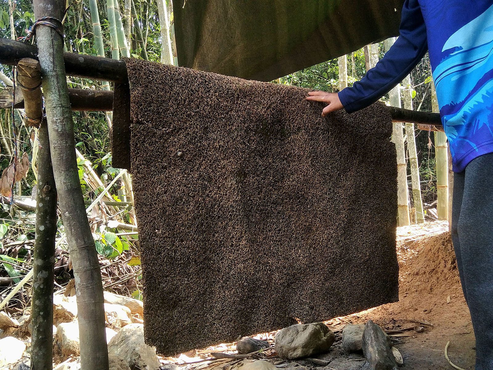 Sebuah pondok beratapkan terpal hijau masih berdiri di salah satu titik area yang diduga bekas tambang ilegal. Di dalamnya ditemukan sehelai karpet yang biasa digunakan untuk menyaring emas.