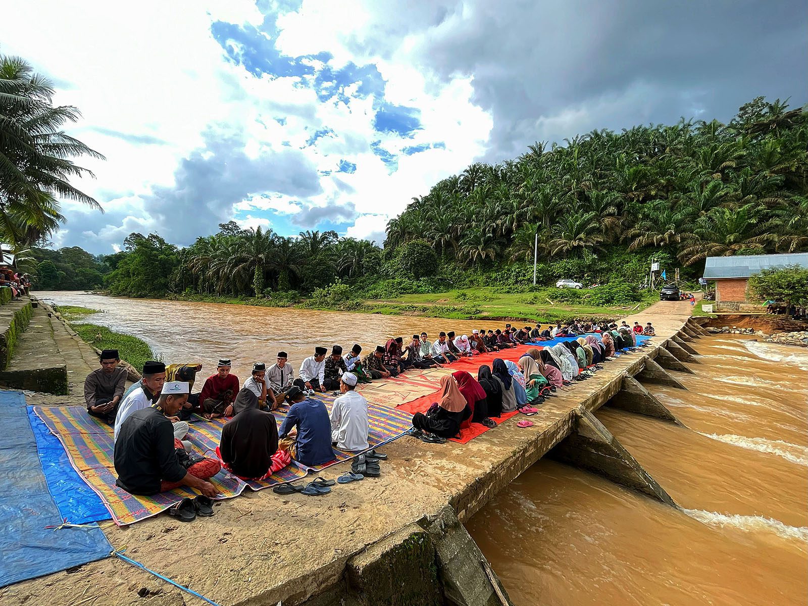 Warga lalu menggelar doa bersama. Selepas salat Jumat, 29 Desember 2023, pemuda hingga lansia berbondong-bondong mendatangi jembatan beton di dusun. Karpet berwarna biru dan merah dibentangkan di sana.