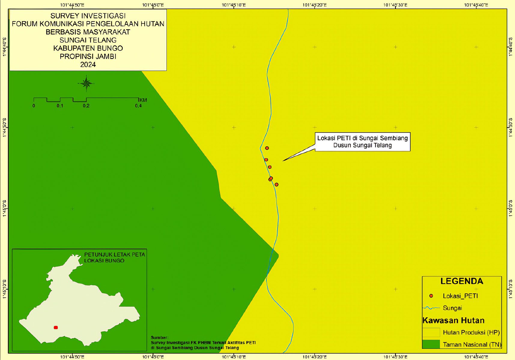Januari 2024, Forum Komunikasi Pengelolaan Hutan Berbasis Masyarakat Bukit Panjang Rantau Bayur (Bujang Raba) melaporkan aktivitas PETI ke Penegakkan Hukum (Gakkum) Kementerian Lingkungan Hidup dan Kehutanan (KLHK).