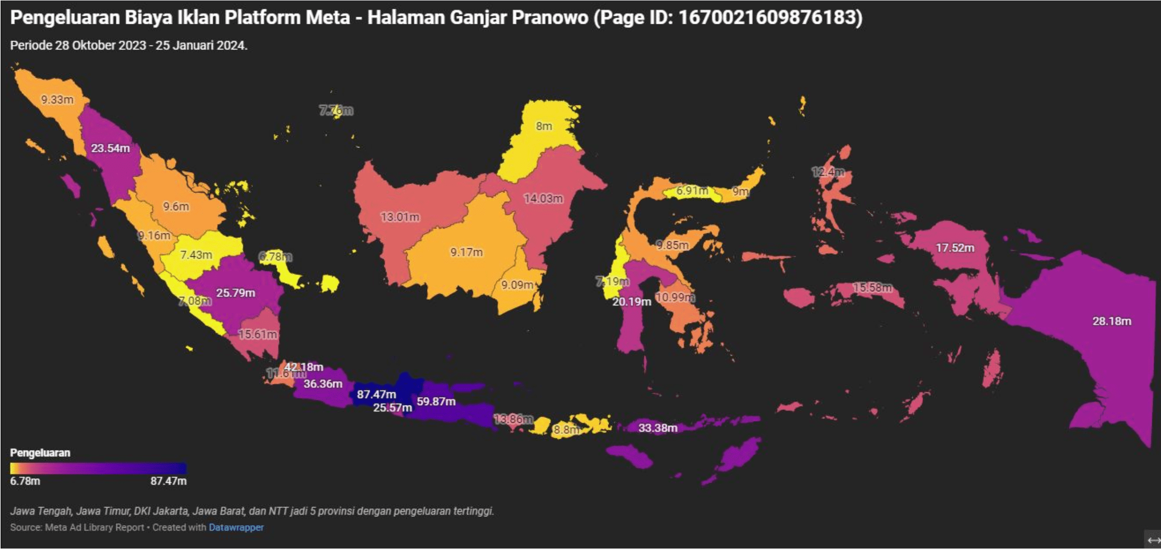 Pengeluaran iklan kampanye Ganjar terlihat sangat menonjol di Jawa Tengah, yang merupakan kandang dari Ganjar sendiri, dengan proporsi pengeluaran mencapai 13.83% atau Rp87.471.193, kemudian disusul Jawa Timur, DKI Jakarta, Jawa Barat, juga Nusa Tenggara Timur. Strategi dari tim Ganjar nampaknya mencoba mempertahankan basis dukungan sambil mencoba ekspansi ke provinsi-provinsi lainnya.