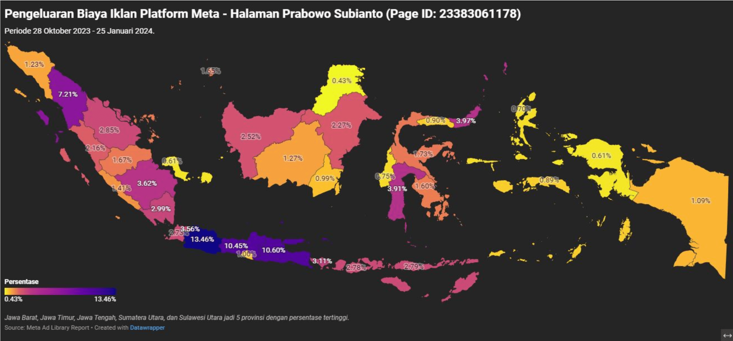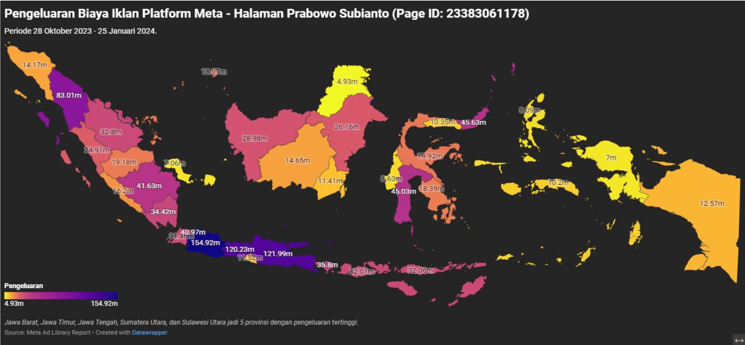 Lima provinsi dengan proporsi atau jumlah pengeluaran tertinggi dari keseluruhan iklan Prabowo adalah Jawa Barat, Jawa Timur, Jawa Tengah, Sumatera Utara, dan Sulawesi Utara.