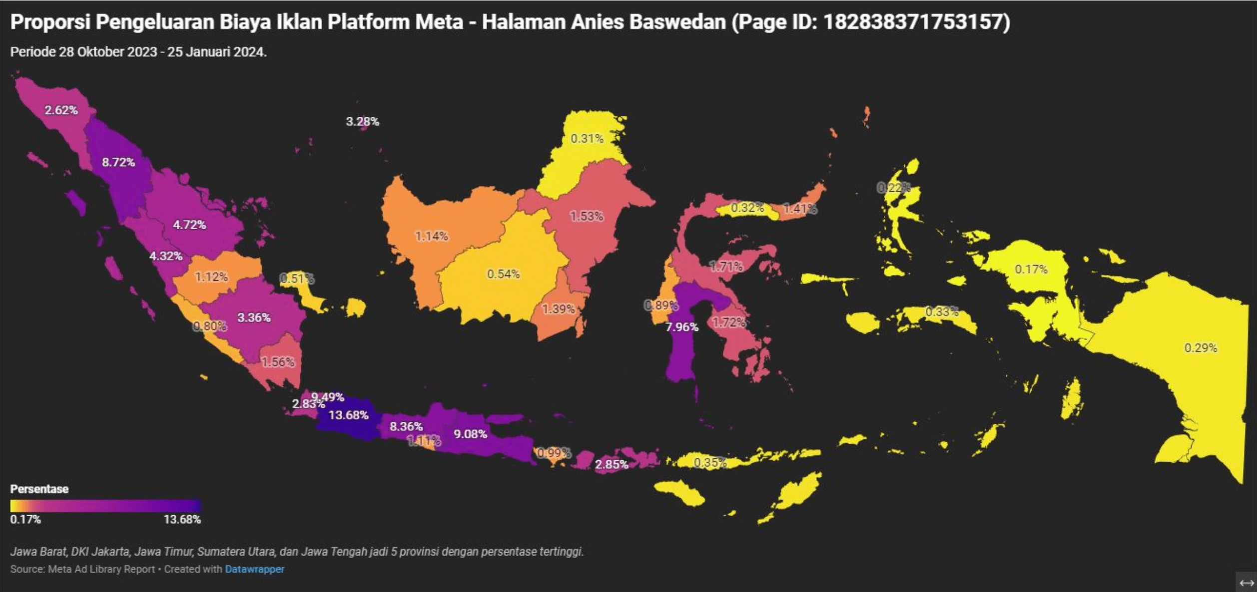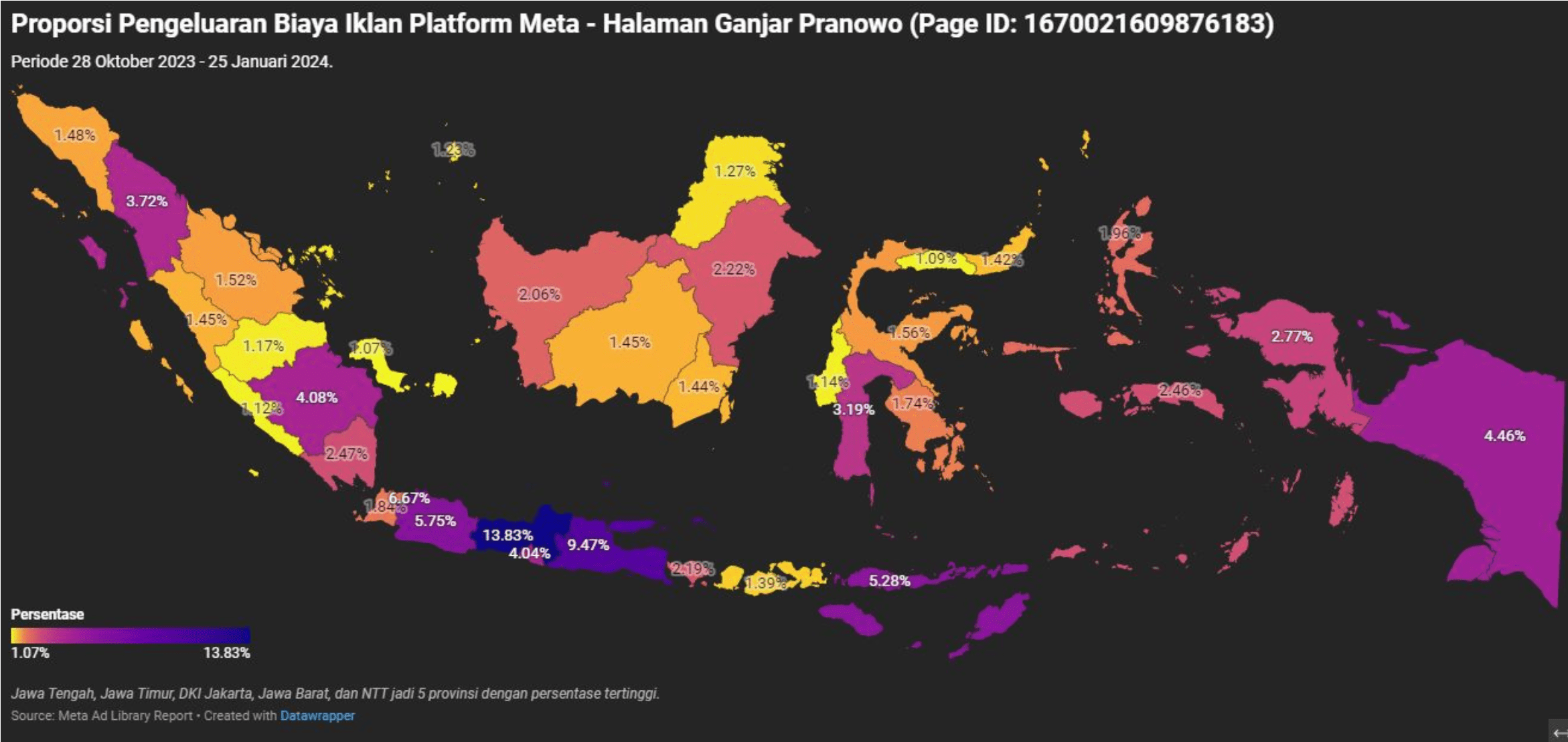 Hasilnya menunjukkan terdapat 894 jaringan pengiklan di Meta yang terindikasi mendanai iklan politik untuk ketiga pasang calon. Iklan politik terkait Prabowo – Gibran mendominasi belanja iklan di Facebook yaitu mencapai Rp28,6 miliar. Sementara iklan terkait Ganjar Pranowo – Mahfud MD hanya berkisar Rp9,9 miliar dan Anies Baswedan – Muhaimin Iskandar Rp5,2 miliar.
