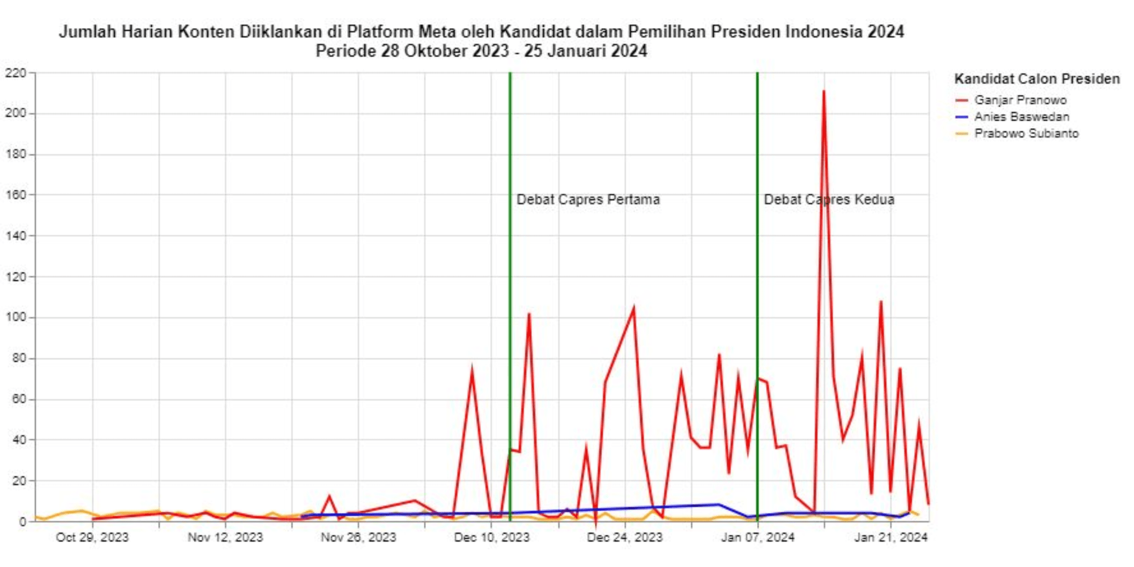Tim liputan mencoba menganalisis iklan kampanye politik calon presiden di platform Meta dalam Pemilu 2024. Analisis berfokus pada iklan-iklan kategori politik yang ditayangkan di Indonesia dengan kata kunci nama ketiga calon presiden; Anies, Prabowo, dan Ganjar. Periode penayangan Iklan yang dianalisis mengambil rentang waktu 1 Januari 2023 sampai 31 Januari 2024.