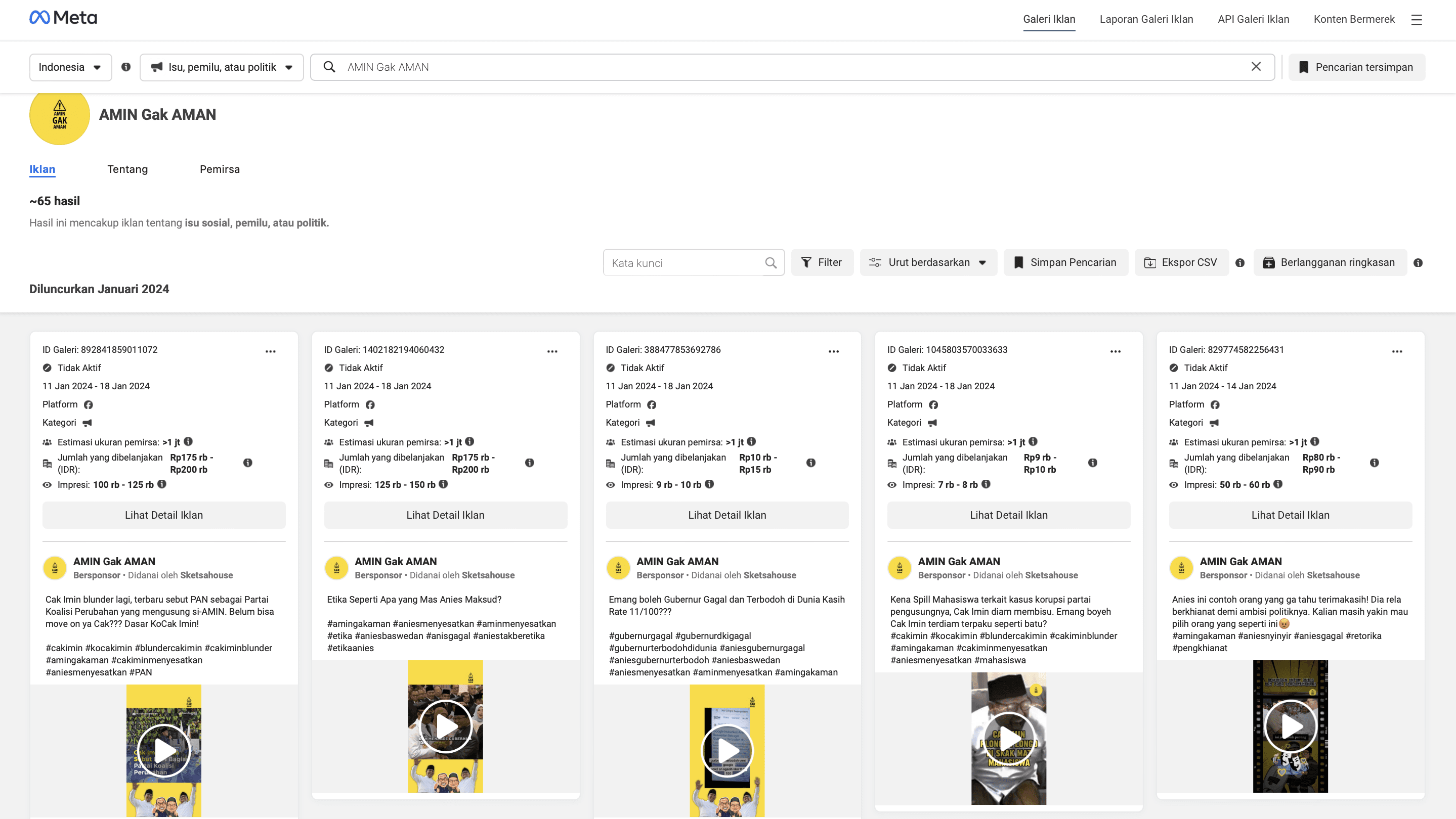 Selain itu, akun Amin gak Aman juga terdeteksi menerbitkan iklan politik mengandung hoaks. “Katanya anti ordal, tapi kok? Istri sendiri jadi Bunda Paud, Anies Baswedan kasih uang Rp63 Miliar!!!!! Ciyeeee memanfaatkan ordal (orang dalam),” tulis akun Amin Gak Aman pada 26 Desember 2023. Terhadap narasi serupa, Mafindo juga sudah mengkategorikannya sebagai hoaks berulang dan dibantah di laman turnbackhoax.id pada Januari 2023.