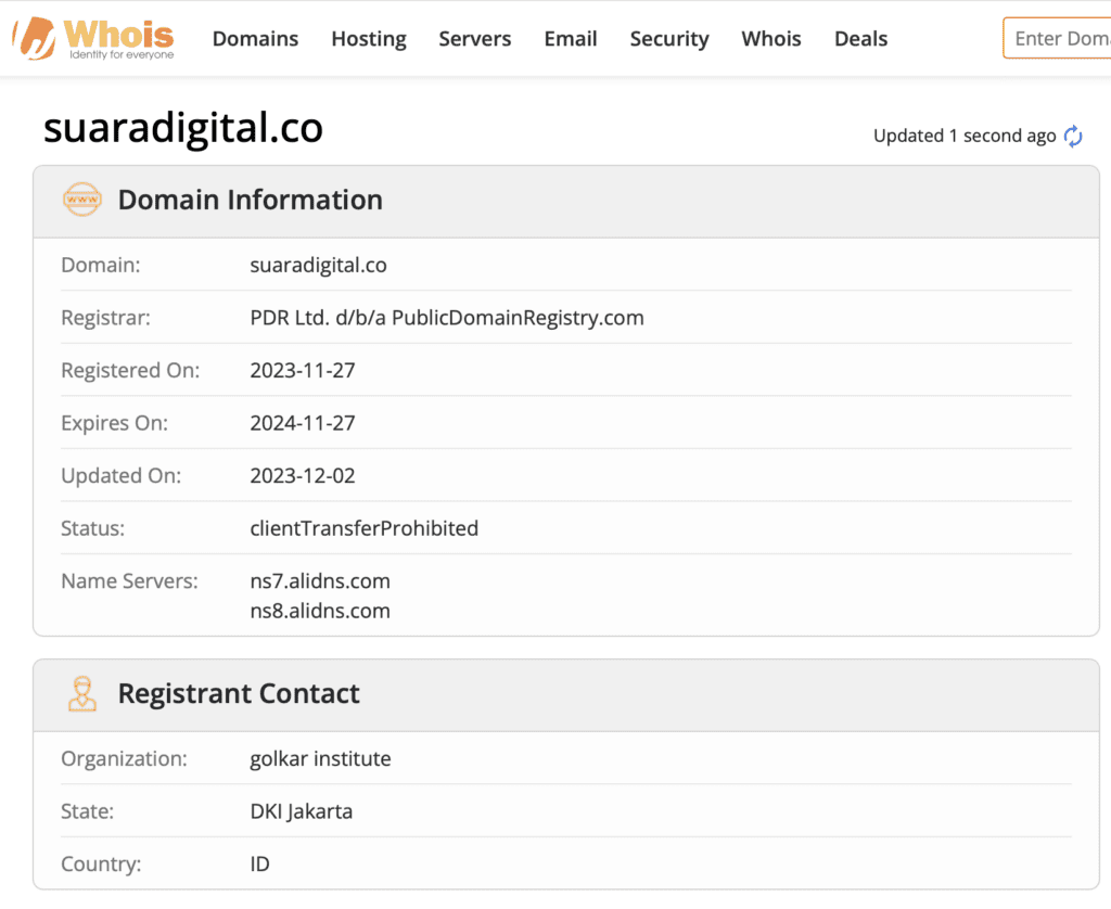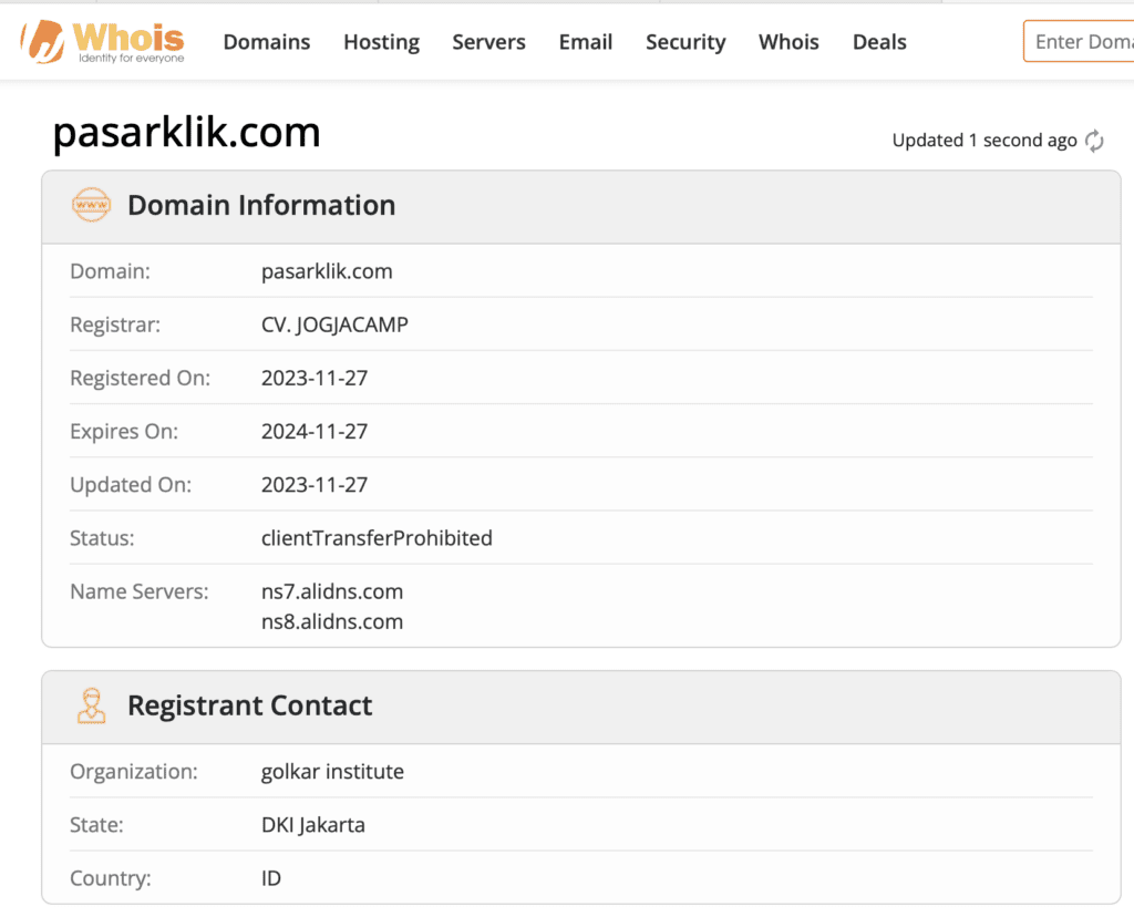 Penelusuran kepemilikan domain Pasar Klik dan Suara Digital lewat platform Whois.com menunjukkan keduanya terhubung dengan Golkar Institute. Keduanya sama-sama mencantumkan Golkar Institute yang beralamat di DKI Jakarta sebagai organisasi pendaftar domain pasarklik.com dan suaradigital.co.