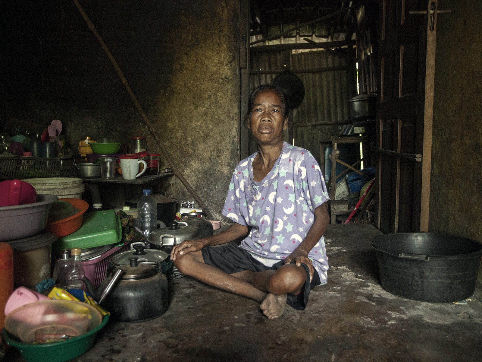 Yang Adek, salah satu dari delapan orang asli Suku Orang Darat di Kampung Sungai Sadap, Pulau Rempang, Batam, Kepulauan Riau duduk di dalam rumah bantuan pemerintah. (Project M/Andaru KZ – CC BY-NC-ND 4.0)